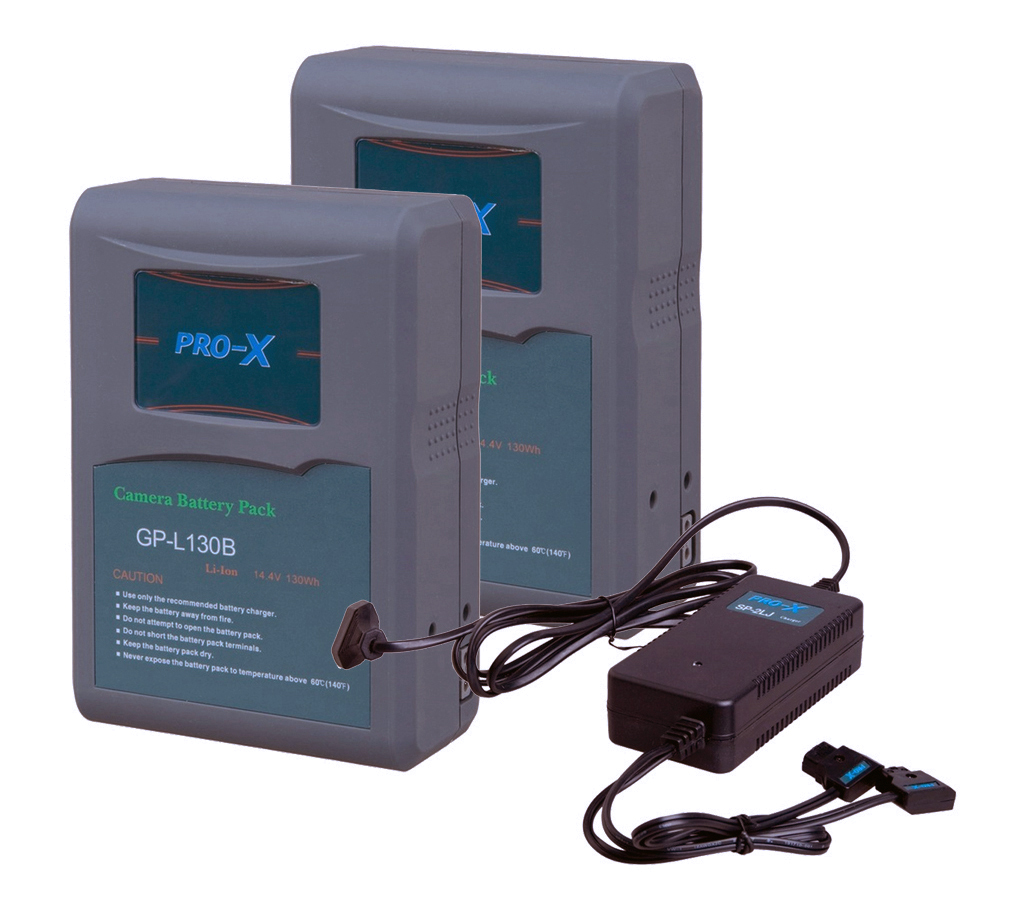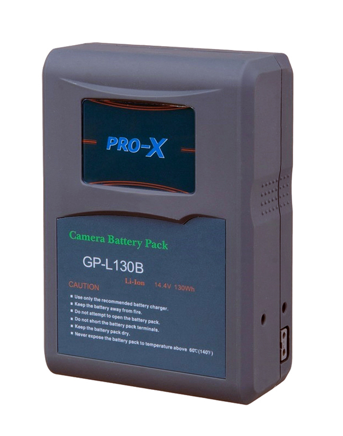 Batería Li-ion PRO-X GPL130B de 130W, 14.4V con montura V-Lock tipo SONY BP y capacidad de 9Ah, ideal para equipos de alta demanda energética.