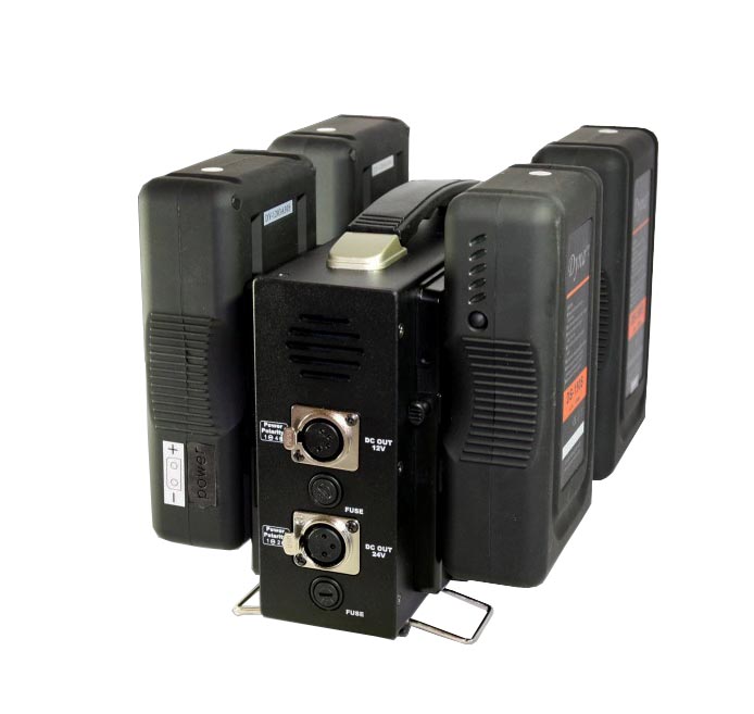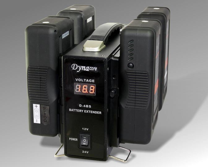 Cargador DYNACORE D-4BS: Extiende 4 baterías V-Lock, salidas XLR-4/3 DC 12V/24V, potencia de 880Wh, 10/5Ah para energía segura y eficiente.