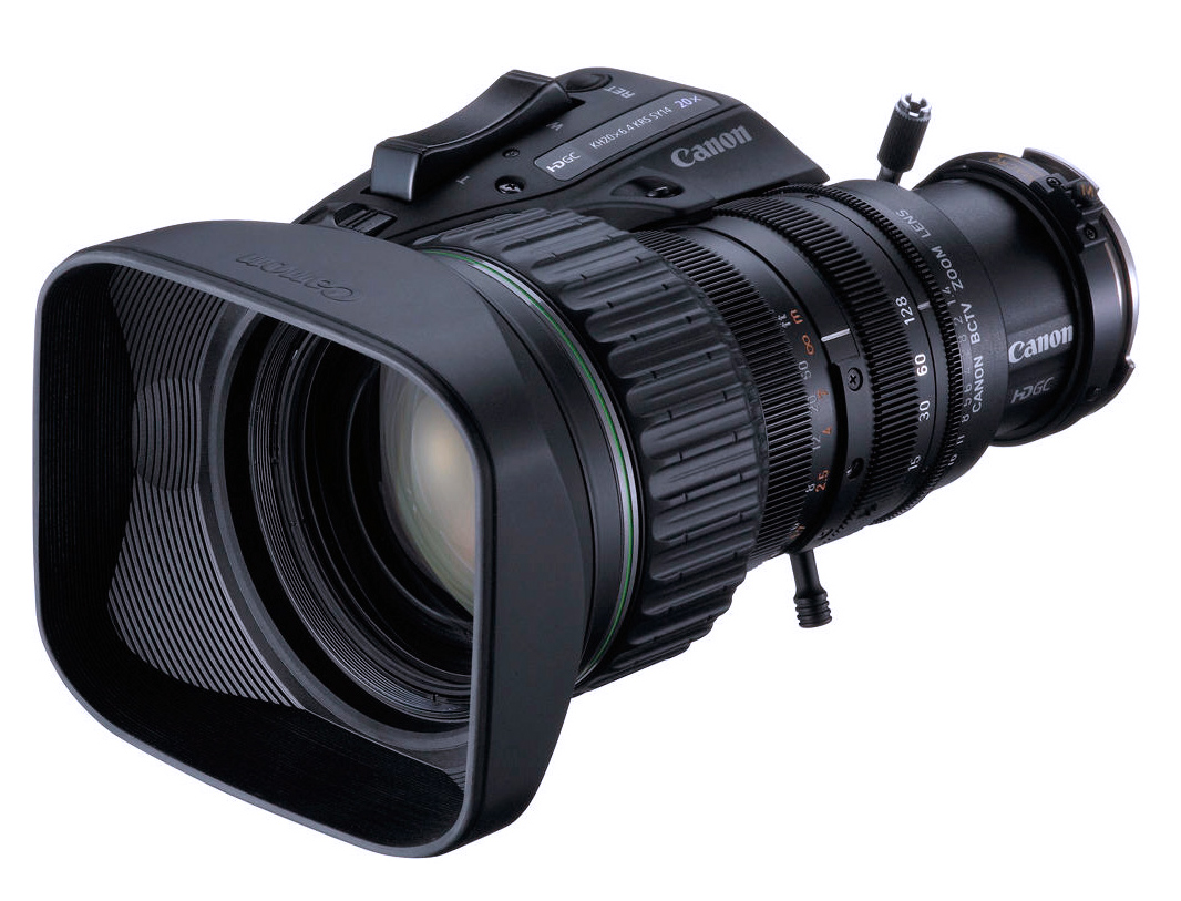 Objetivo Canon KH20x6.4 KRS: Zoom 20x HD, formato 16:9, ideal para XDCAM, distancia focal mínima 0.9m, dimensiones 163.3x103x182.5mm, peso 1.27kg.