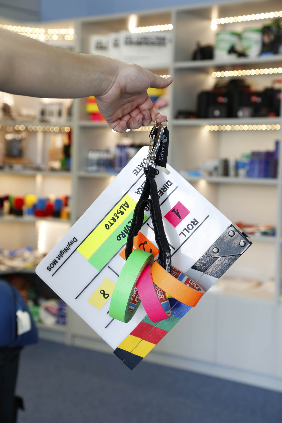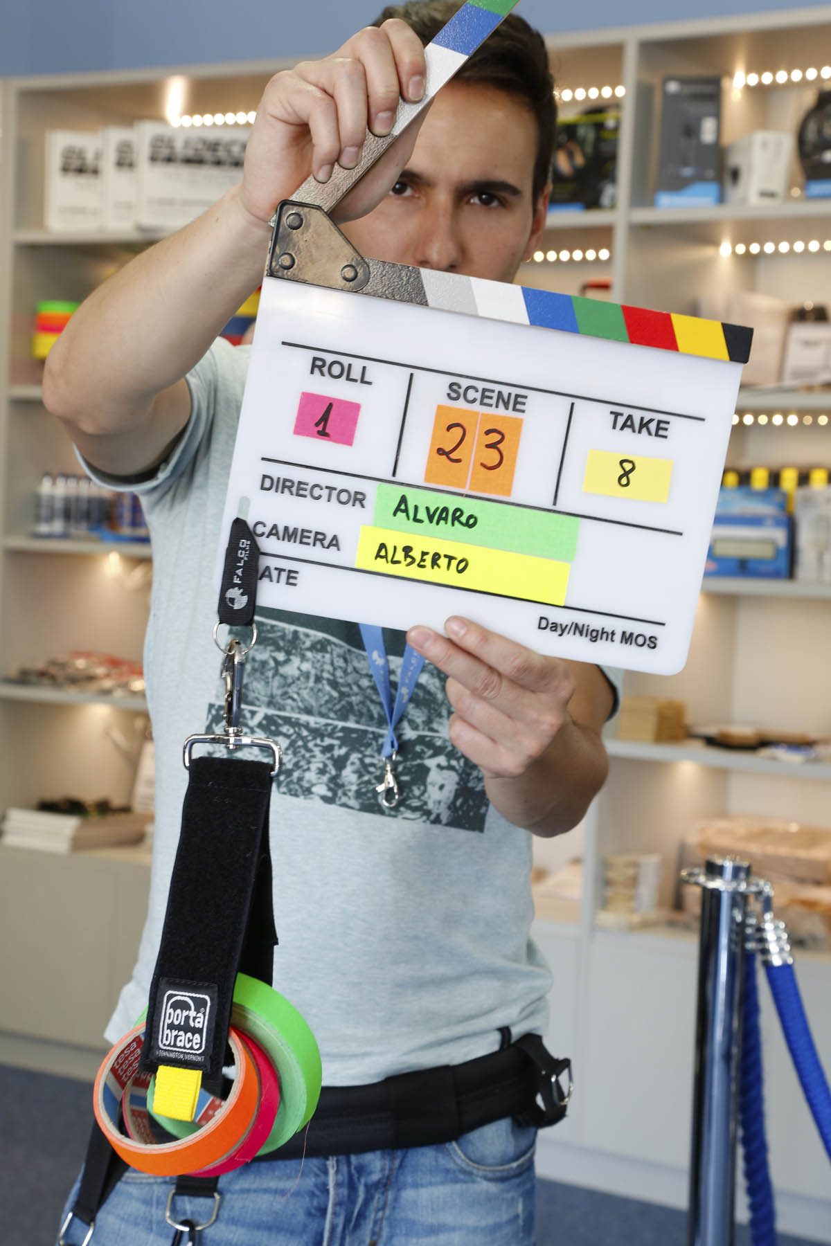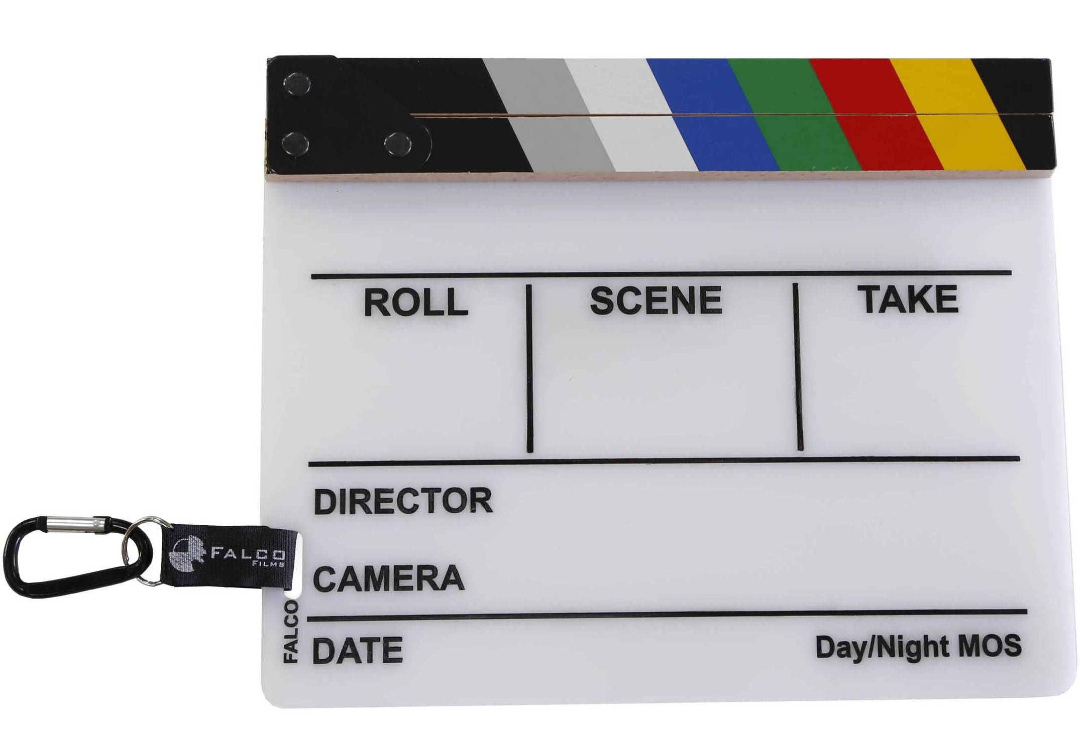 Incluida arandela y mosquetón para colgar la claqueta en un cinturón,