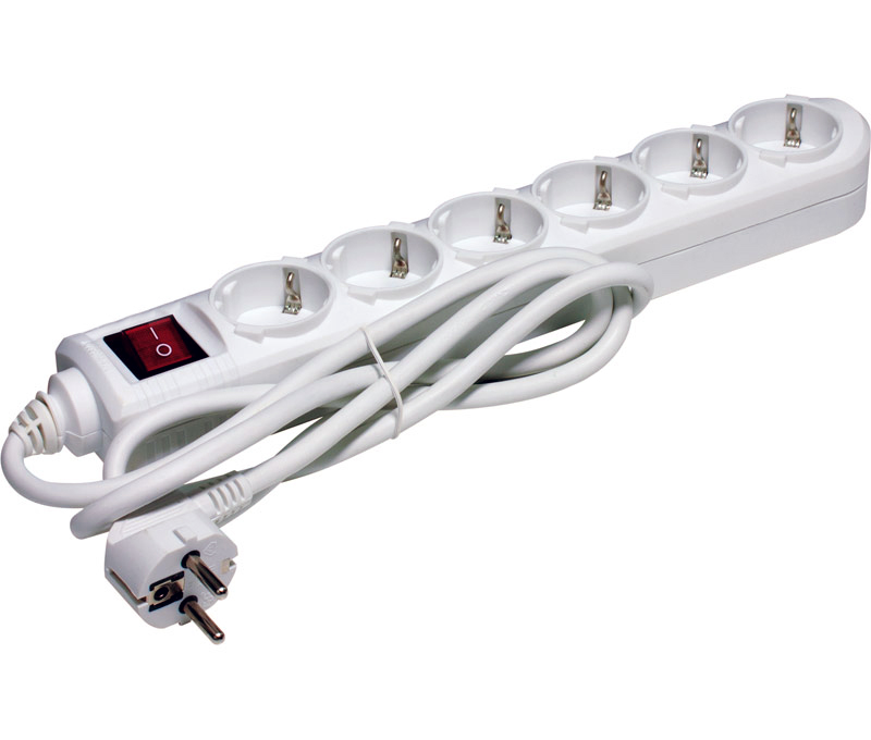 Regleta eléctrica con 6 entradas Schuko, diseño robusto y seguro, ideal para la organización y protección de tus dispositivos electrónicos.