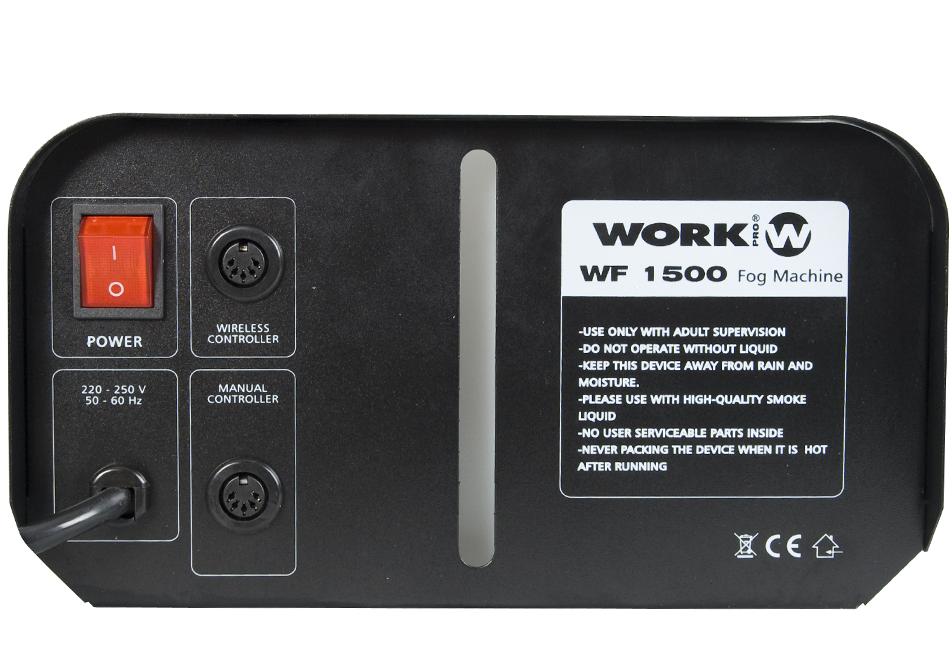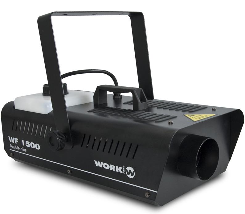 Máquina de humo WF1500 con 1500W, control remoto, depósito de 1 litro y proyección de 5m; ideal para eventos y escenarios.