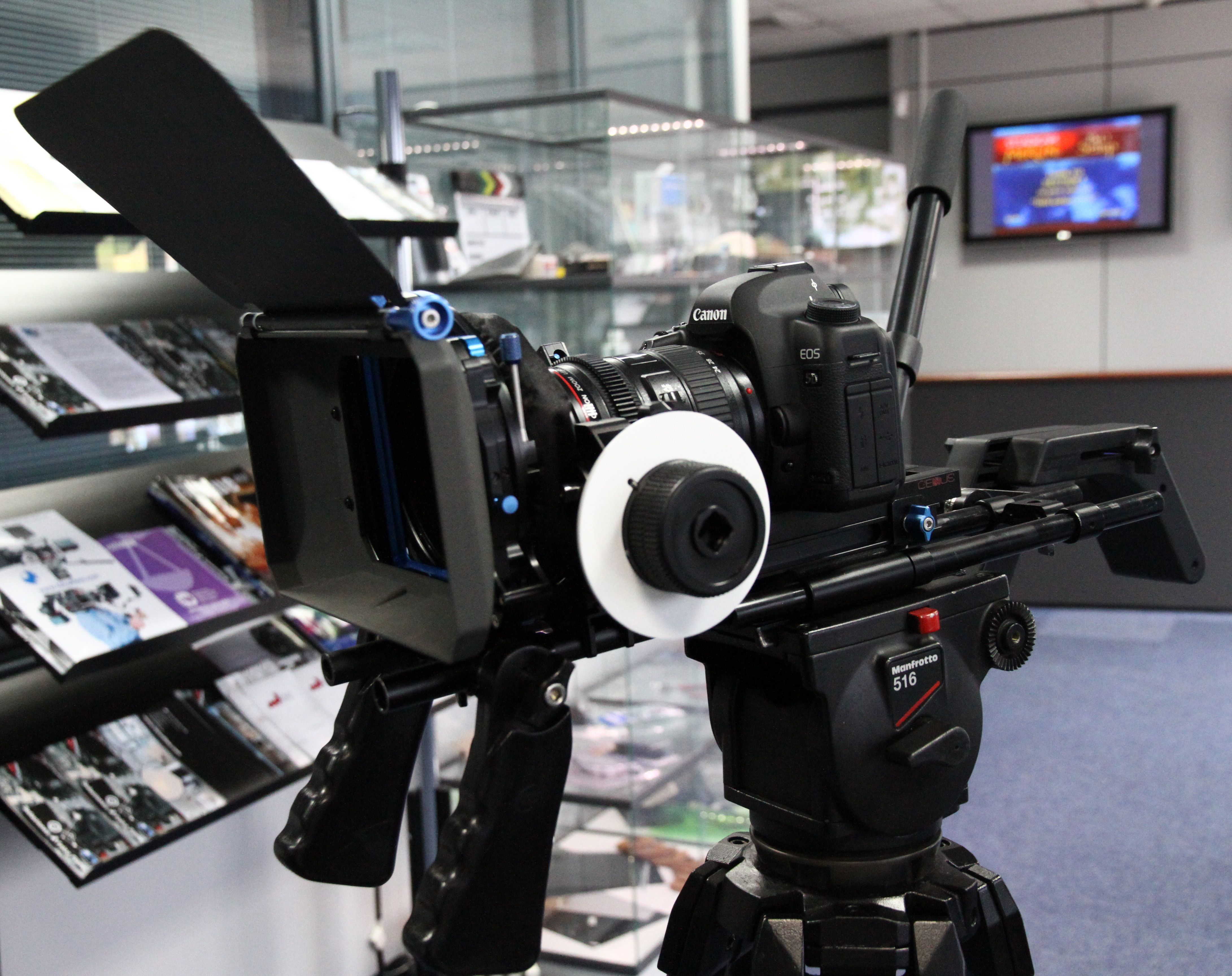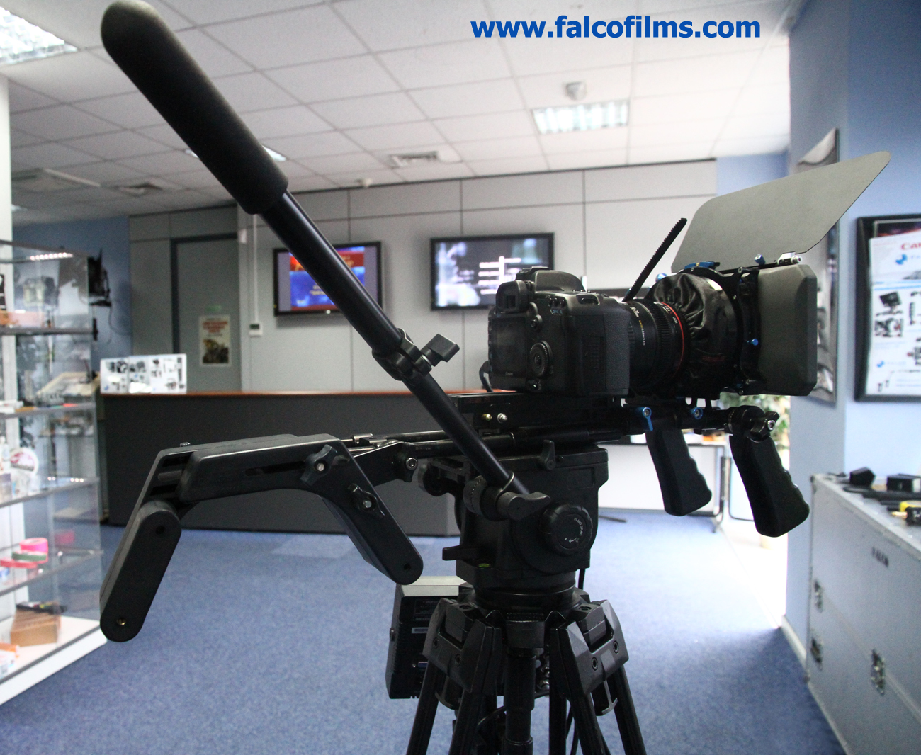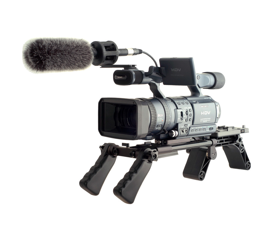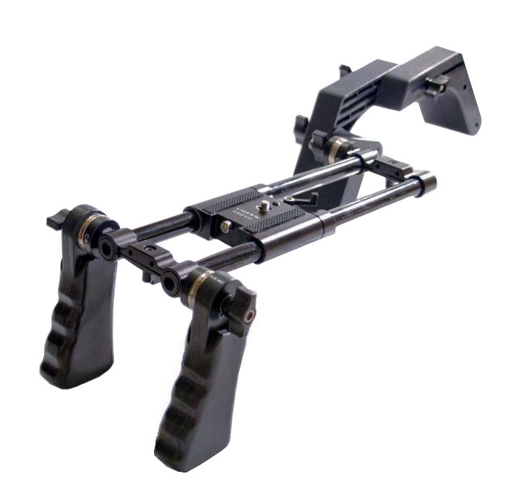 Descubre el estabilizador CAVISION con doble mango y hombrera ajustable, ideal para filmaciones profesionales, incluye barras estándar de 15mm para máxima estabilidad.