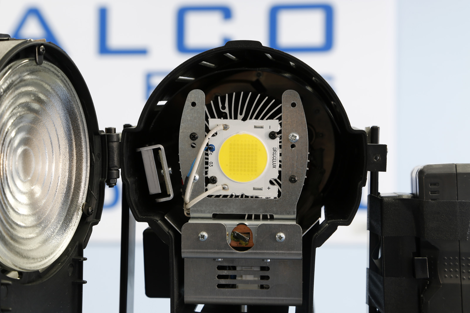 Con lente fresnel de 120mm., componente de 50w.