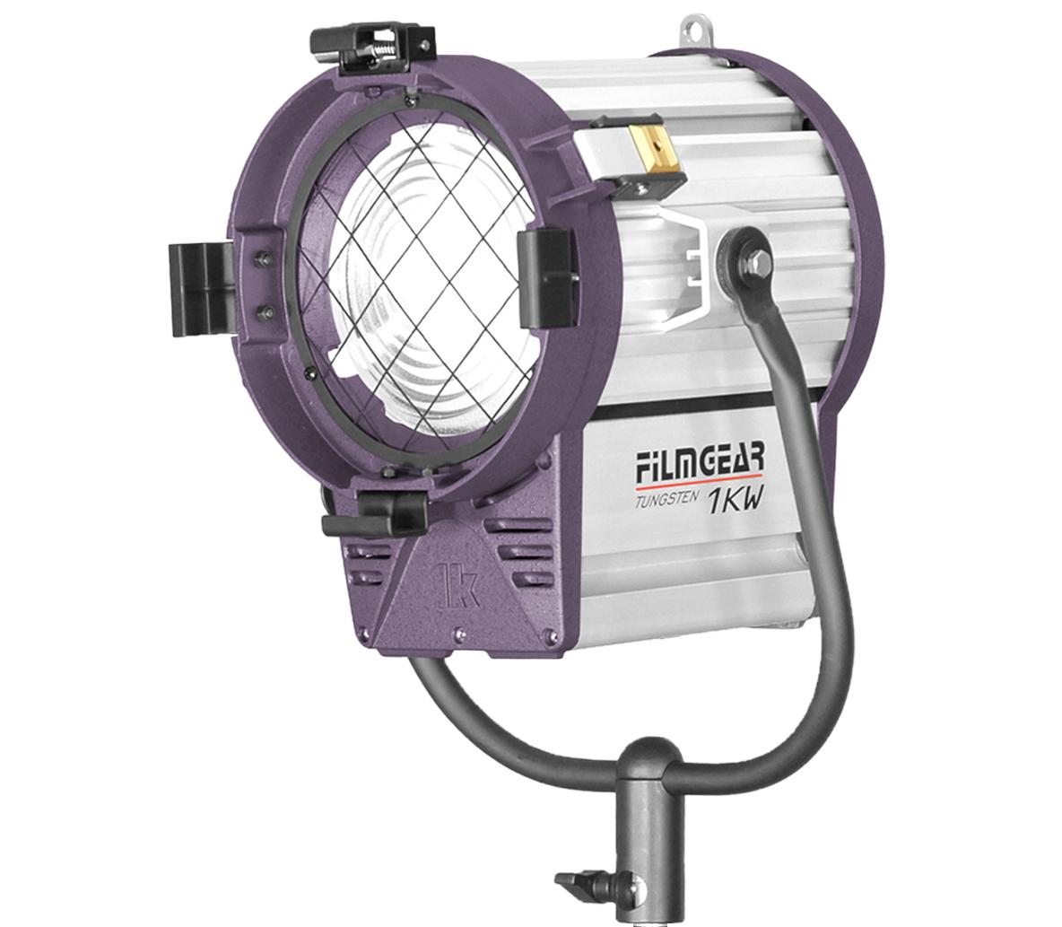 Foco Fresnel FilmGear Junior 1000W con portafiltros, visera, lente de 130mm y fresnel variable de 10° a 57°.