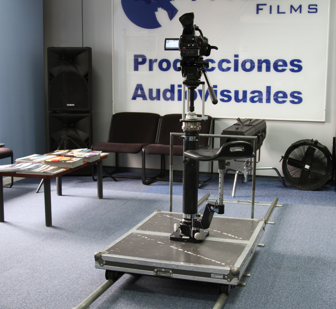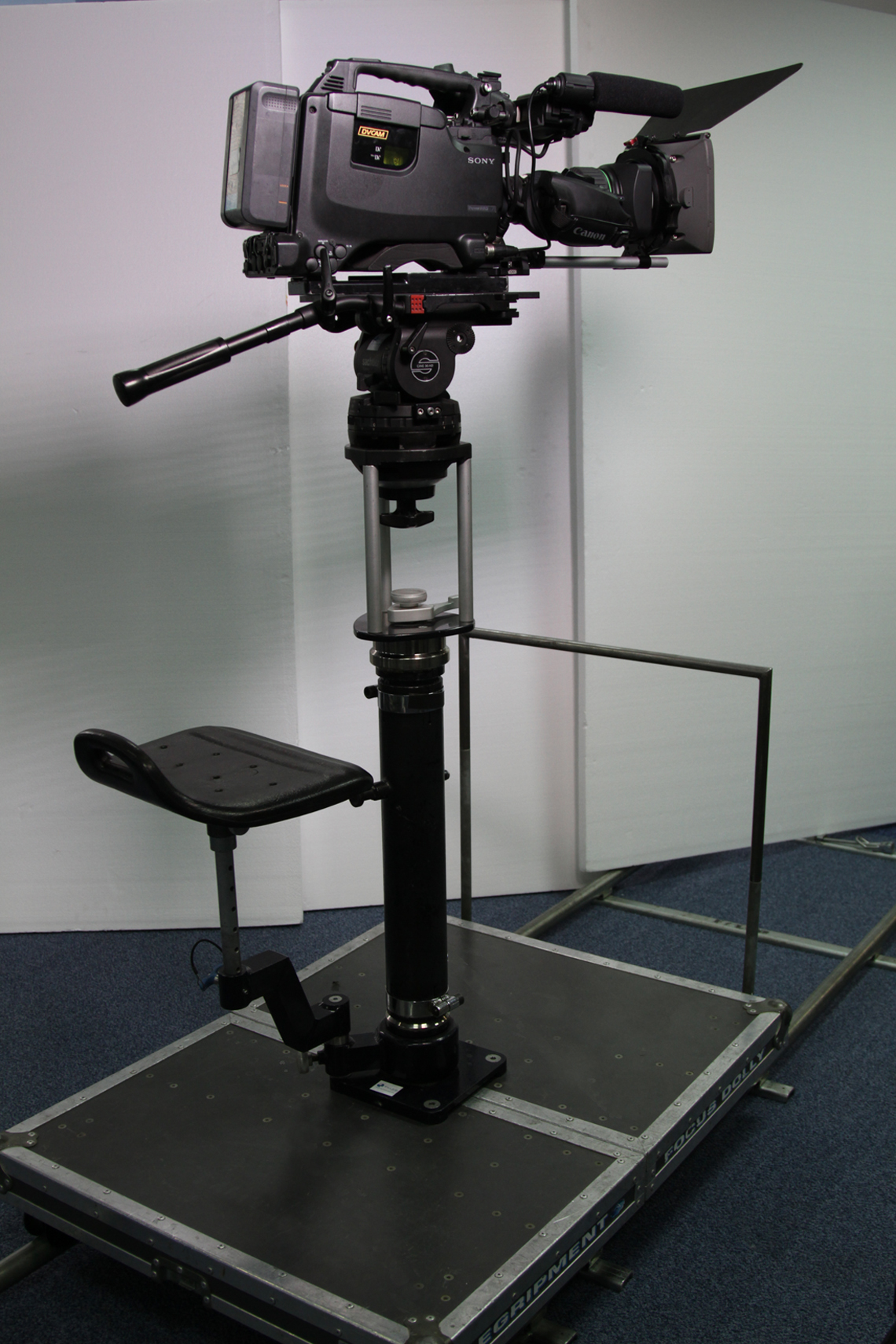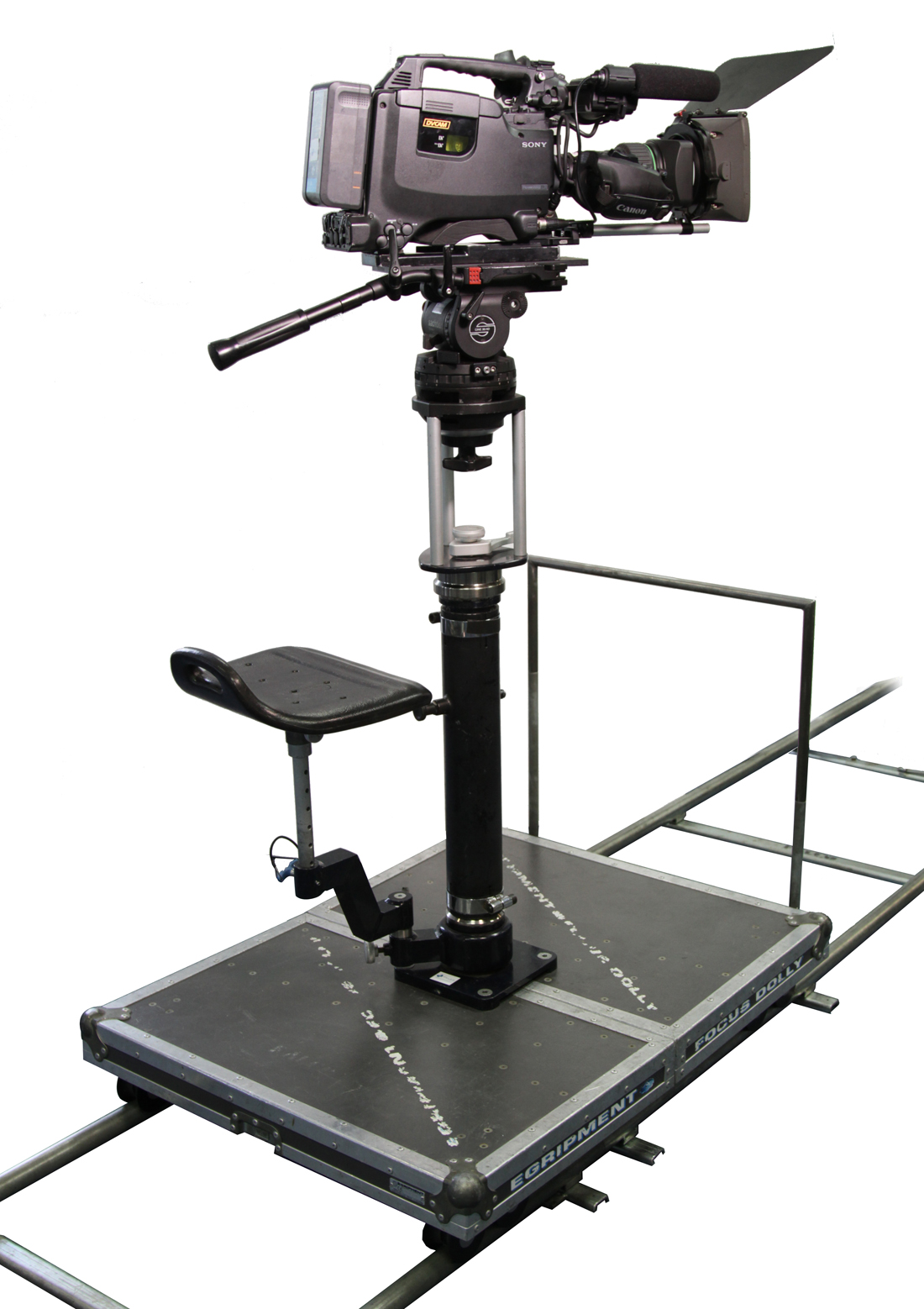 Travelling EGRIPMENT FOCUS DOLLY: completo sistema de dolly con columna, asiento, empuje y copa de trípode, soporta cámaras de cine y vídeo, desmontable y apto para vías curvas.