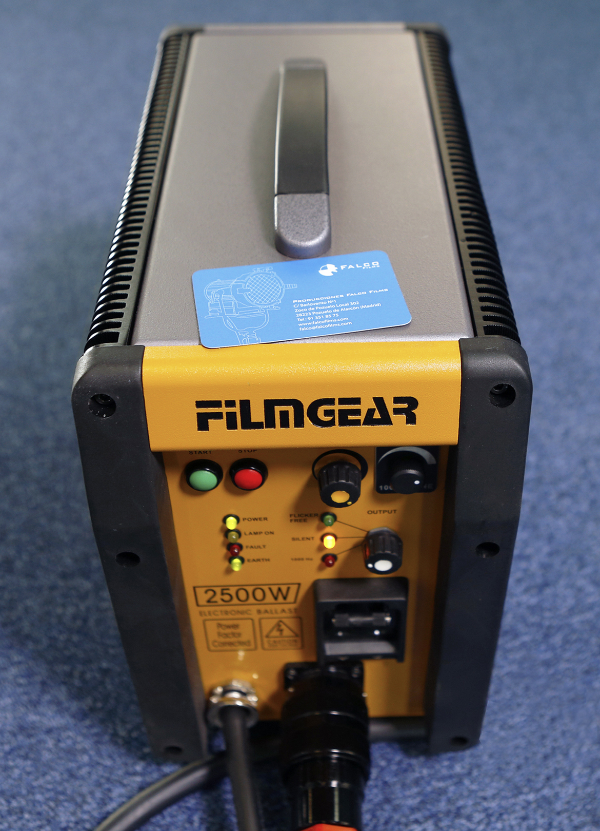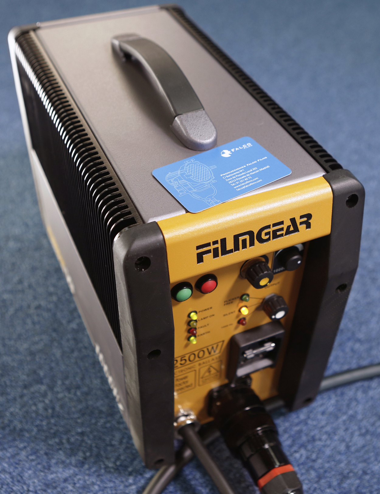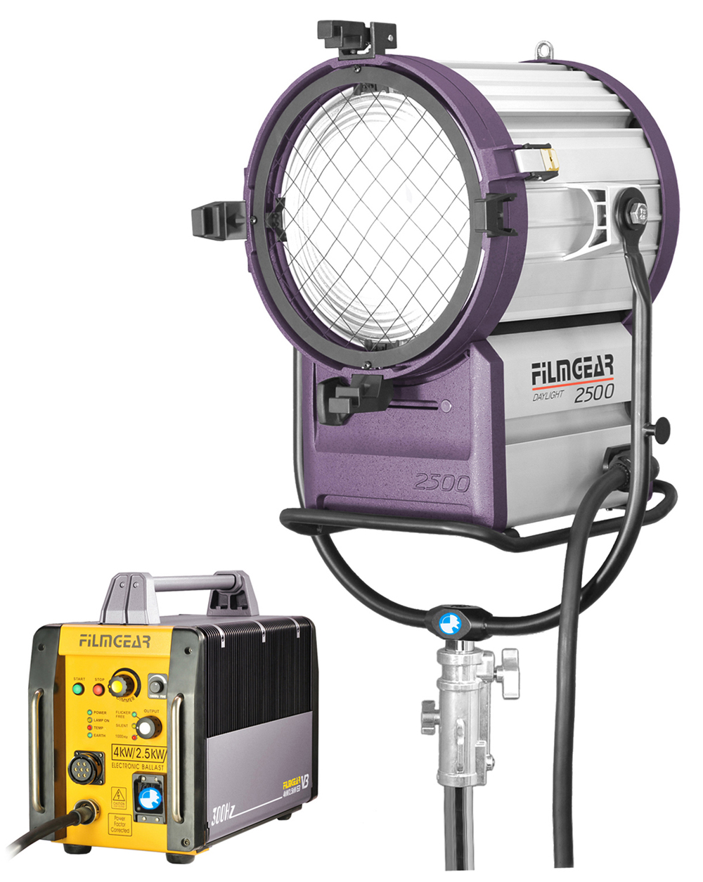 Lámpara HMI Fresnel 2500W Filmgear L02500DS, 16Kg, 220-240V, lente de 250mm, incluye ballast 4KW/2.5KW, pie, visera y manguera en alquiler.