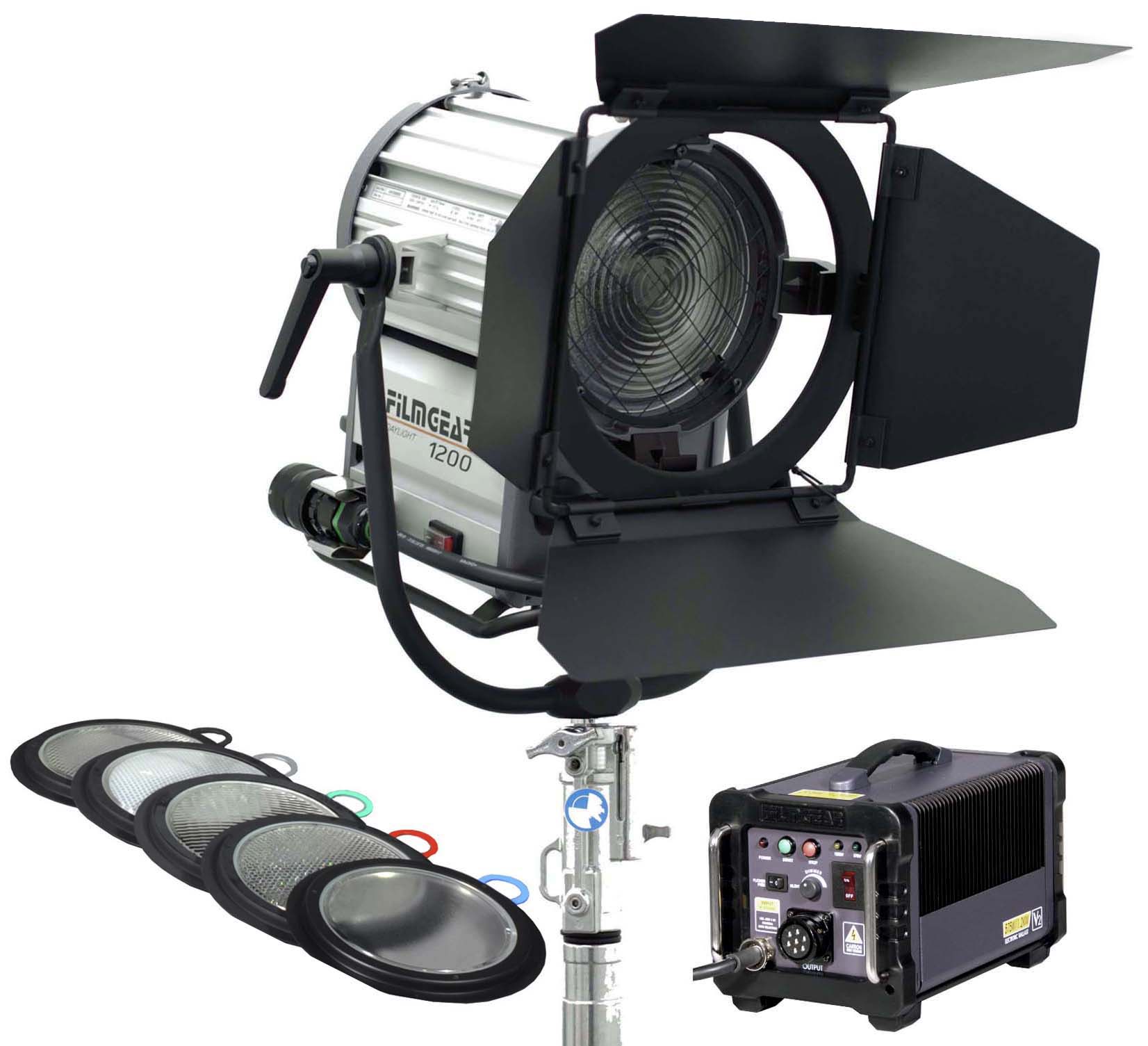 KIT HMI FOCO PAR 1200W: Luz HMI Filmgear 1200W con Ballast Electrónico, pie de foco AVENGER y juego de 5 lentes incluido, ideal para filmación.