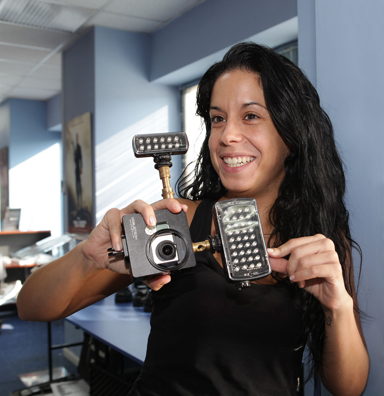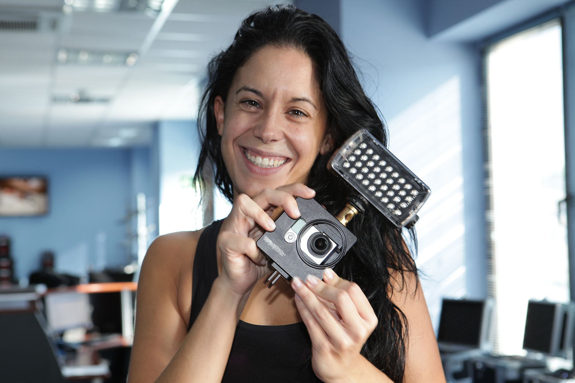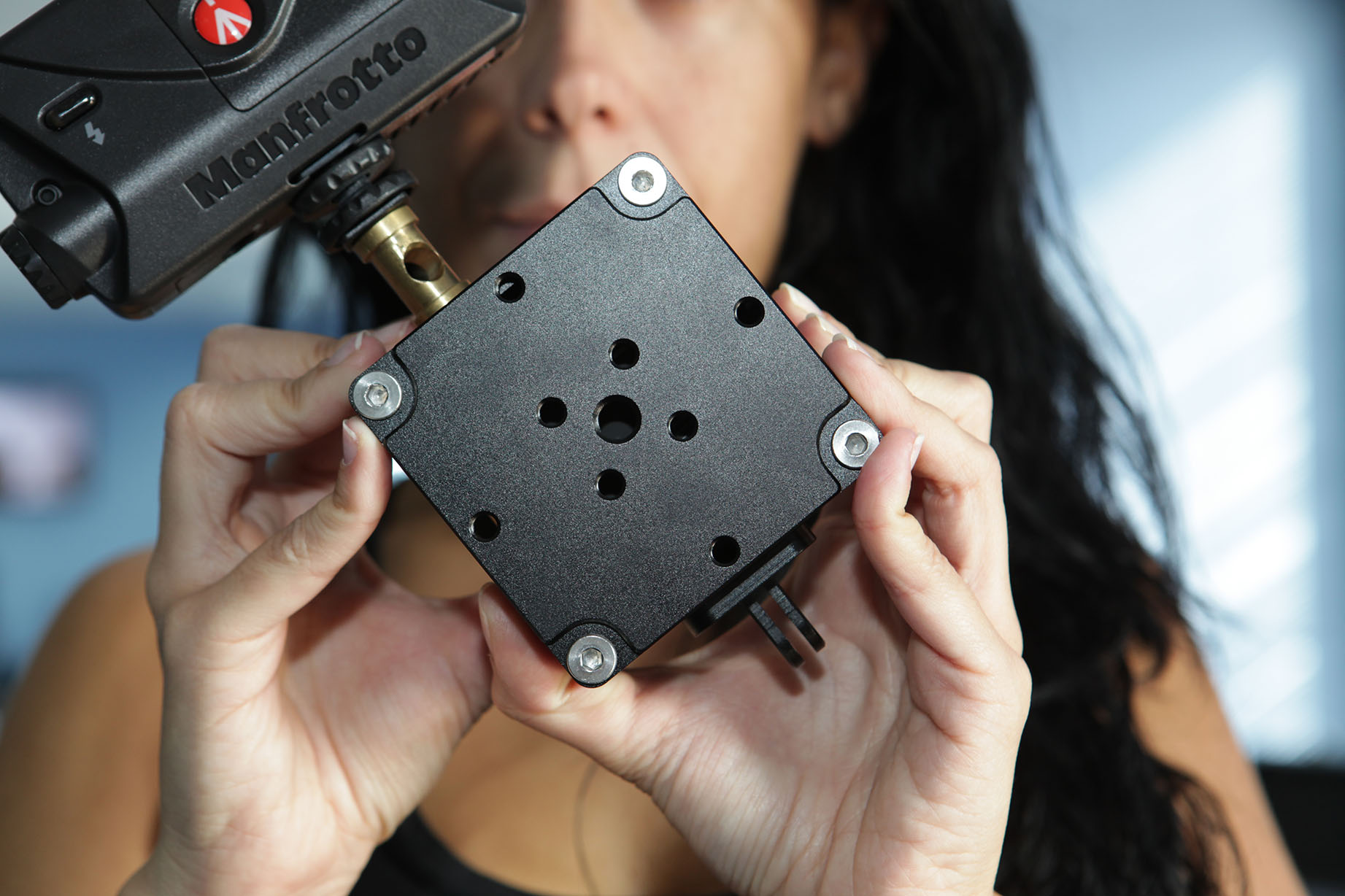 Permite poner la cámara plana en cualquiera de sus 6 caras, y también centrar el eje de la óptica para su montaje en trípode o cualquier otro soporte.