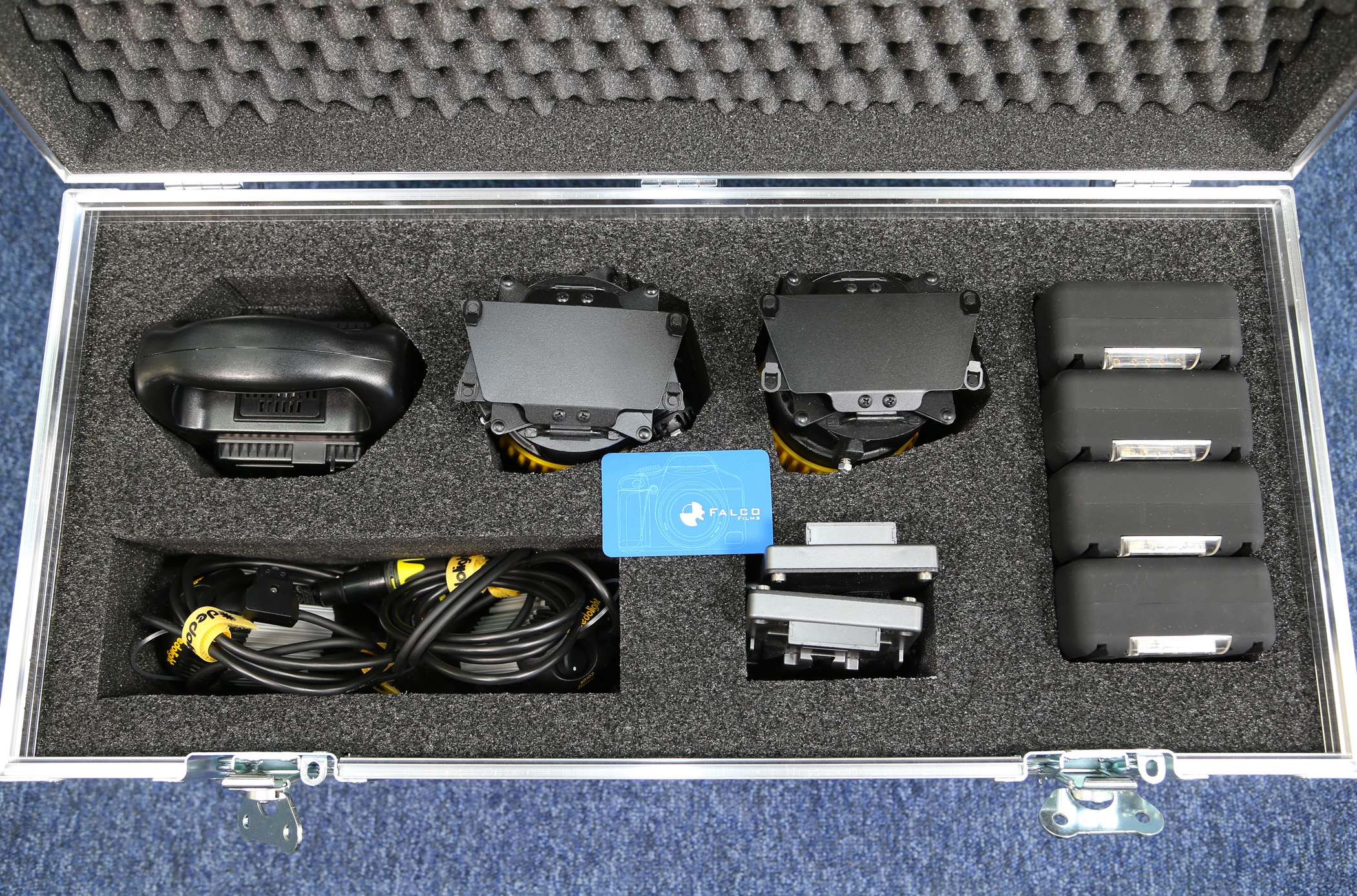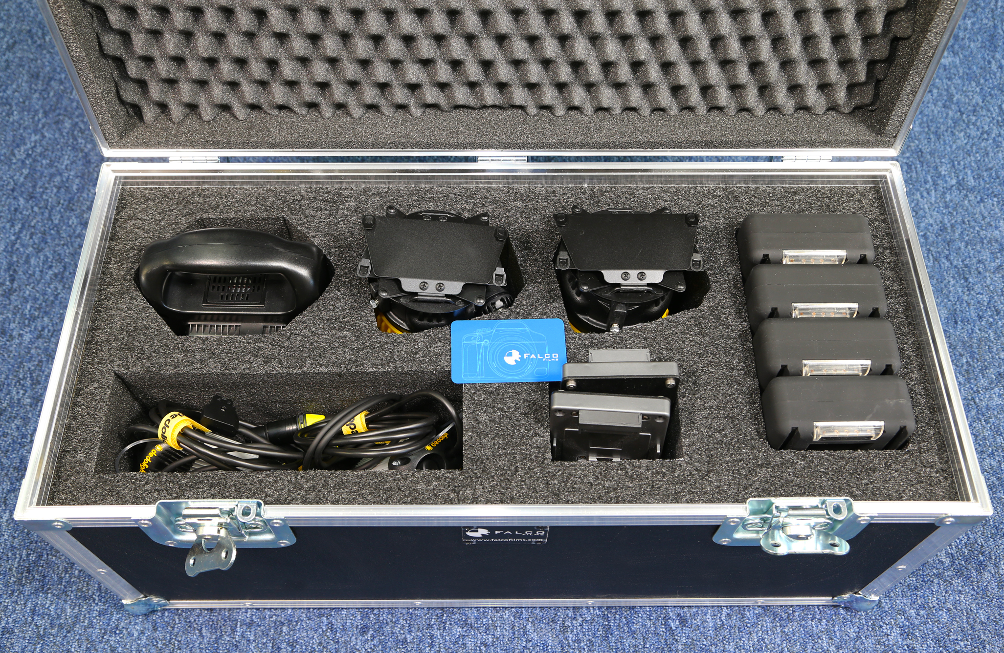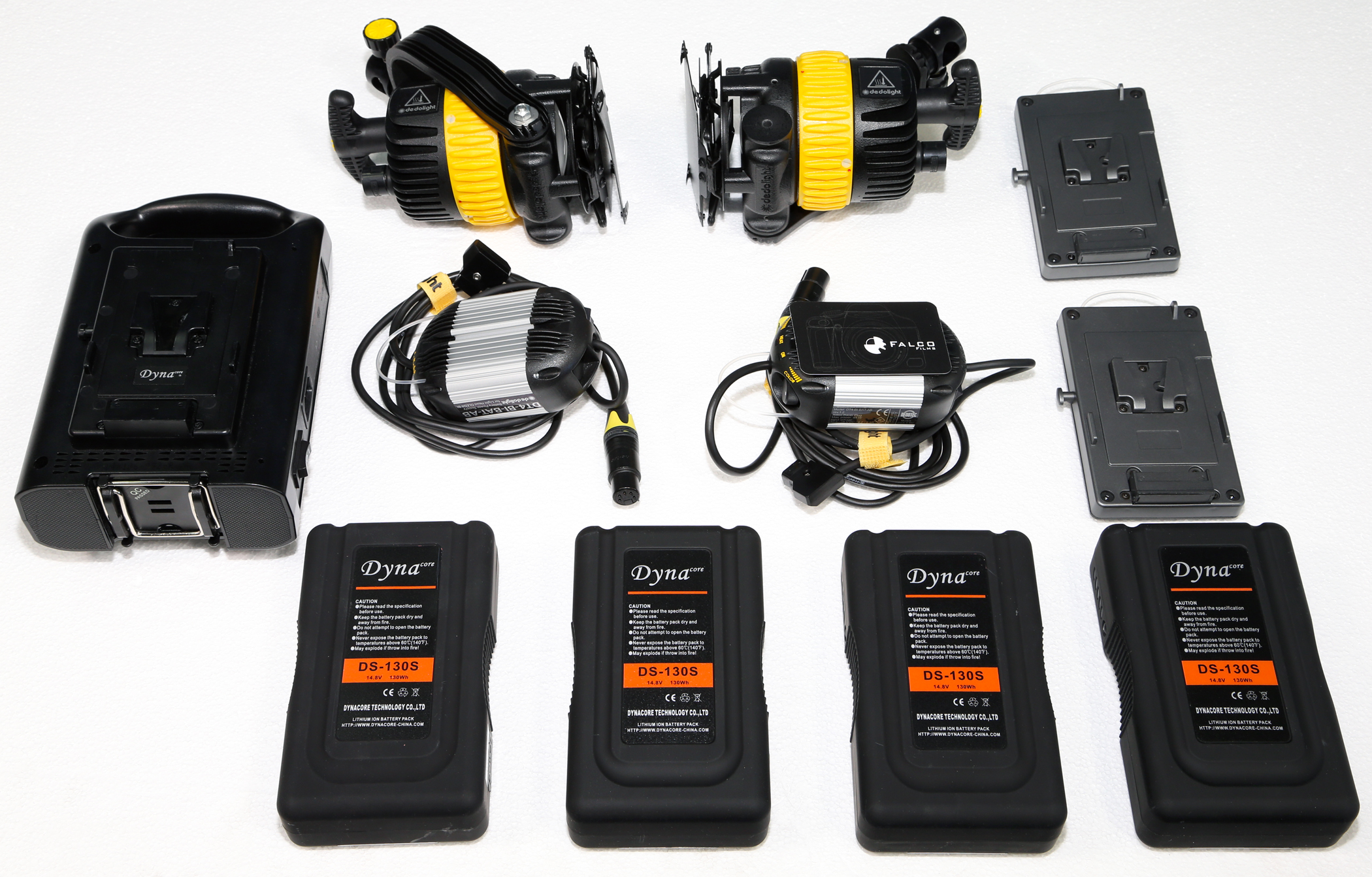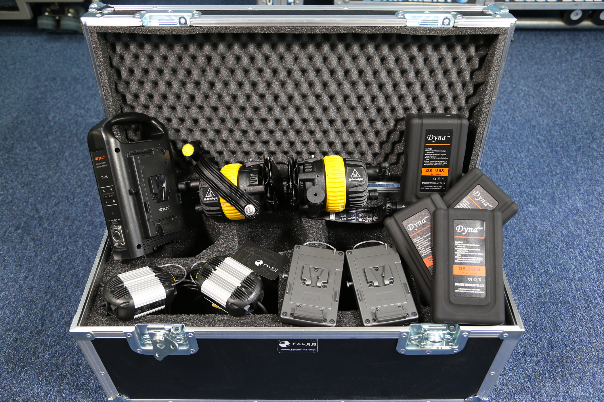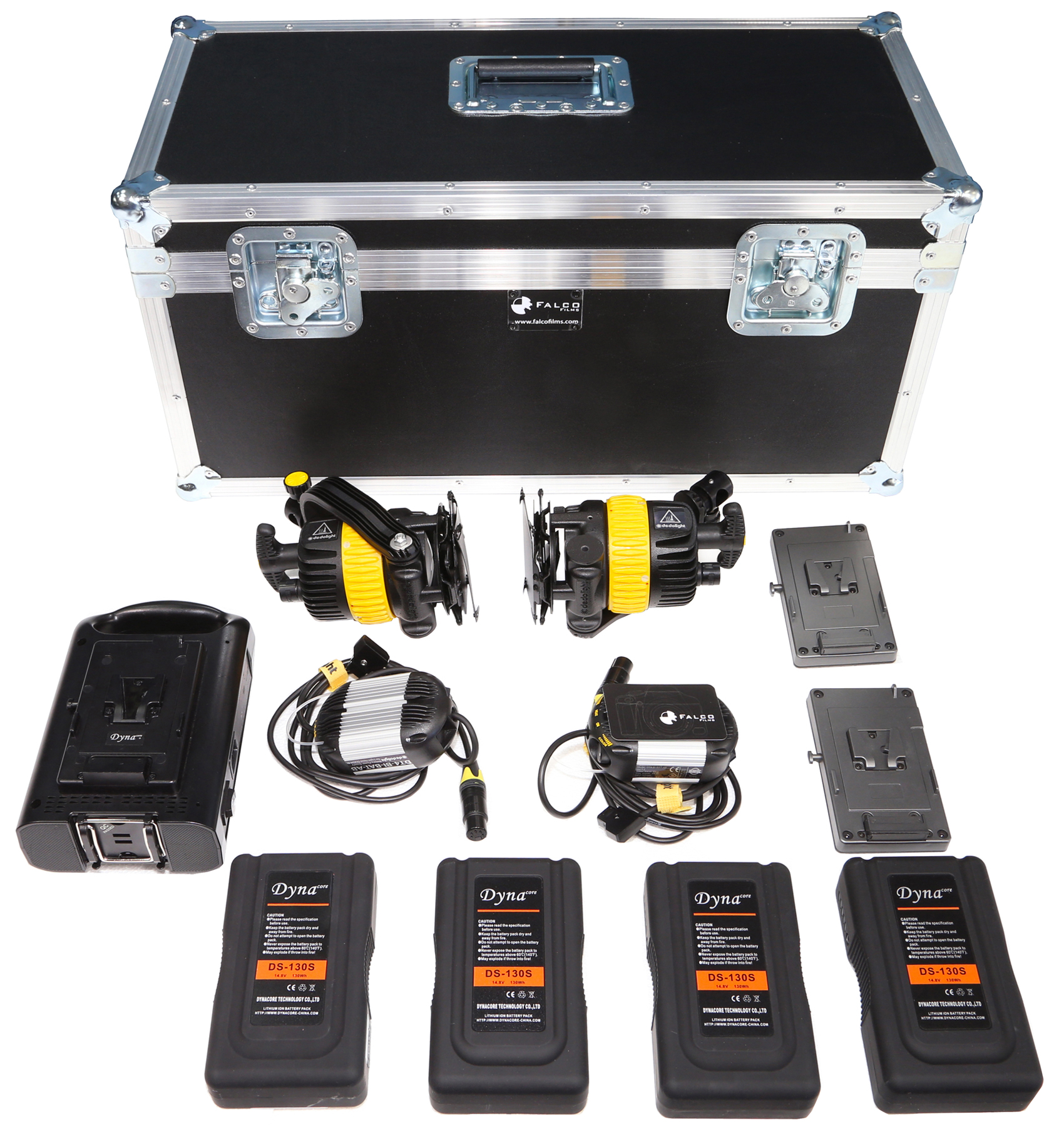Kit Dedolight LED Bicolor ENG en alquiler: incluye 2 focos DLED 4.1-BI, viseras, 4 baterías V-LOC, cargador y maleta de transporte. Perfecto para filmación.