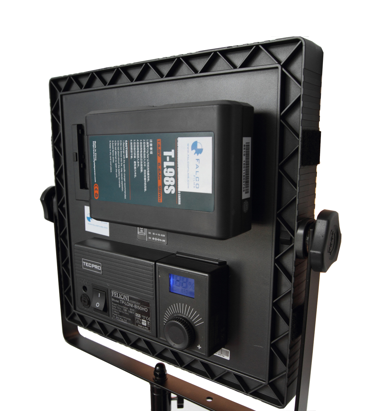 Alquiler de Panel LED FELLONI bicolor HIGH: incluye pie de foco, 576 LEDs, alta potencia, tamaño compacto (30x30 cm), peso ligero (280g).