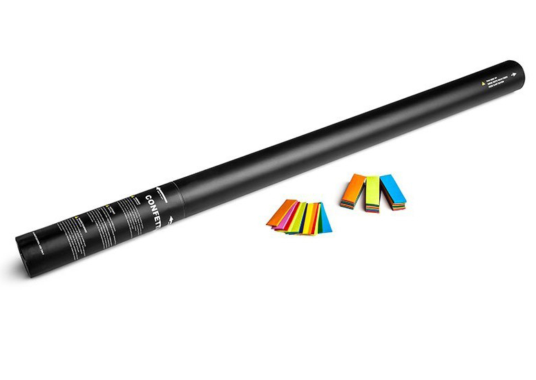 Lanza confeti multicolor de 80cm, manual y con papel rectangular ignífugo, ideal para celebraciones seguras y llenas de color.