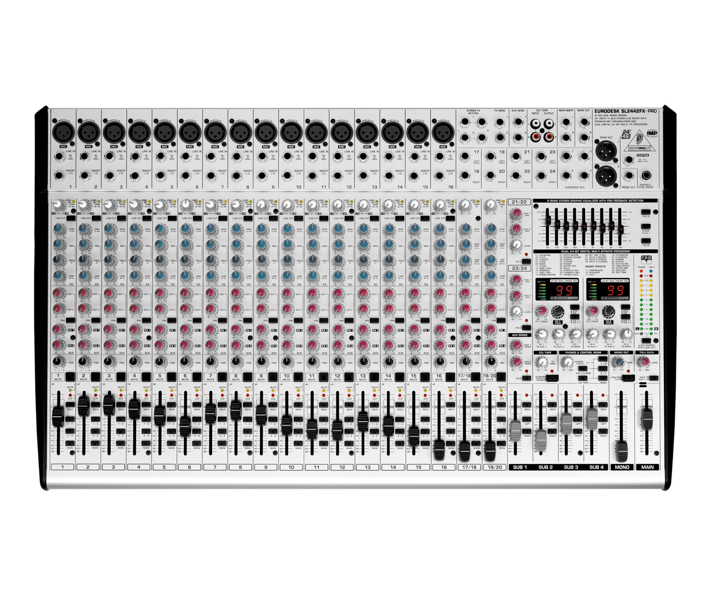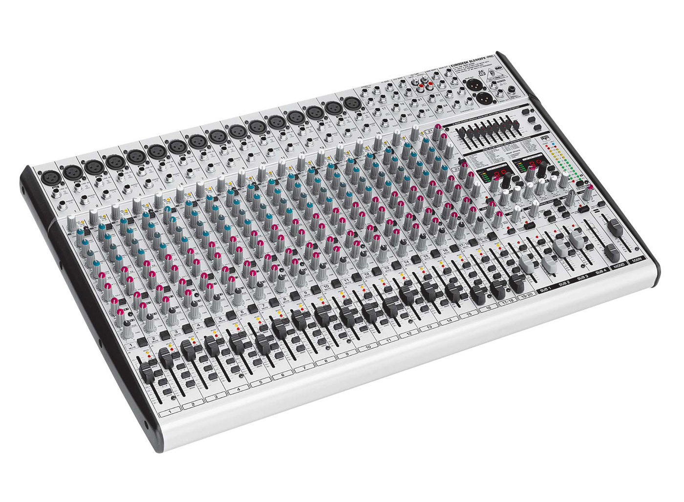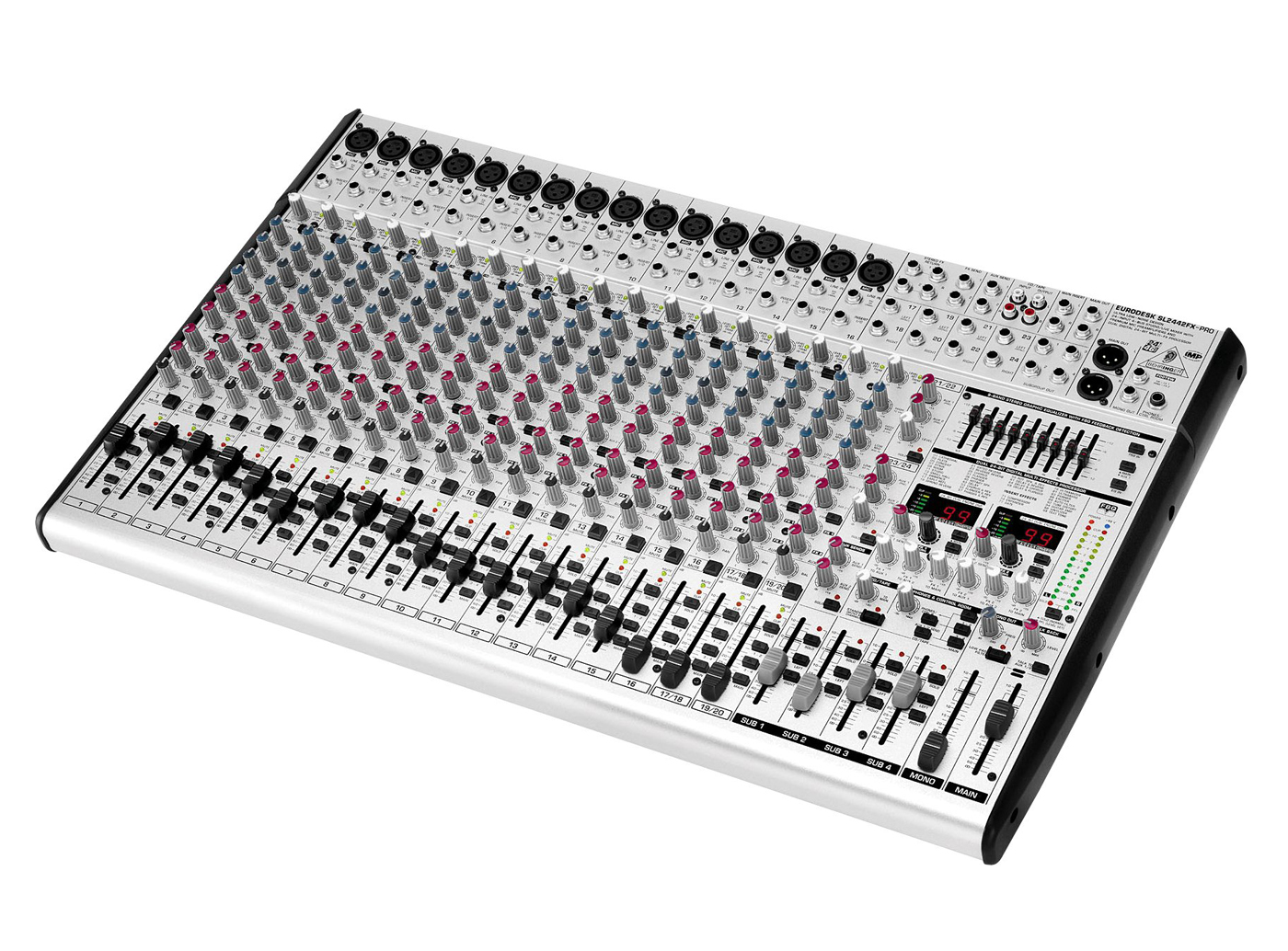 Dispone de 4 subgrupos y cuatro envíos auxiliares conmutables pre/post fader por canal, ecualizadores de 3 bandas con medios semi-paramétricos y filtros pasa altas en los canales mono, canales estéreo con un amplio rango de tolerancia (headroom) completamente equipados con ecualizadores de 4 bandas, además de canales de entrada estéreo adicionales con opciones de nivel y envíos auxiliares prefader.
