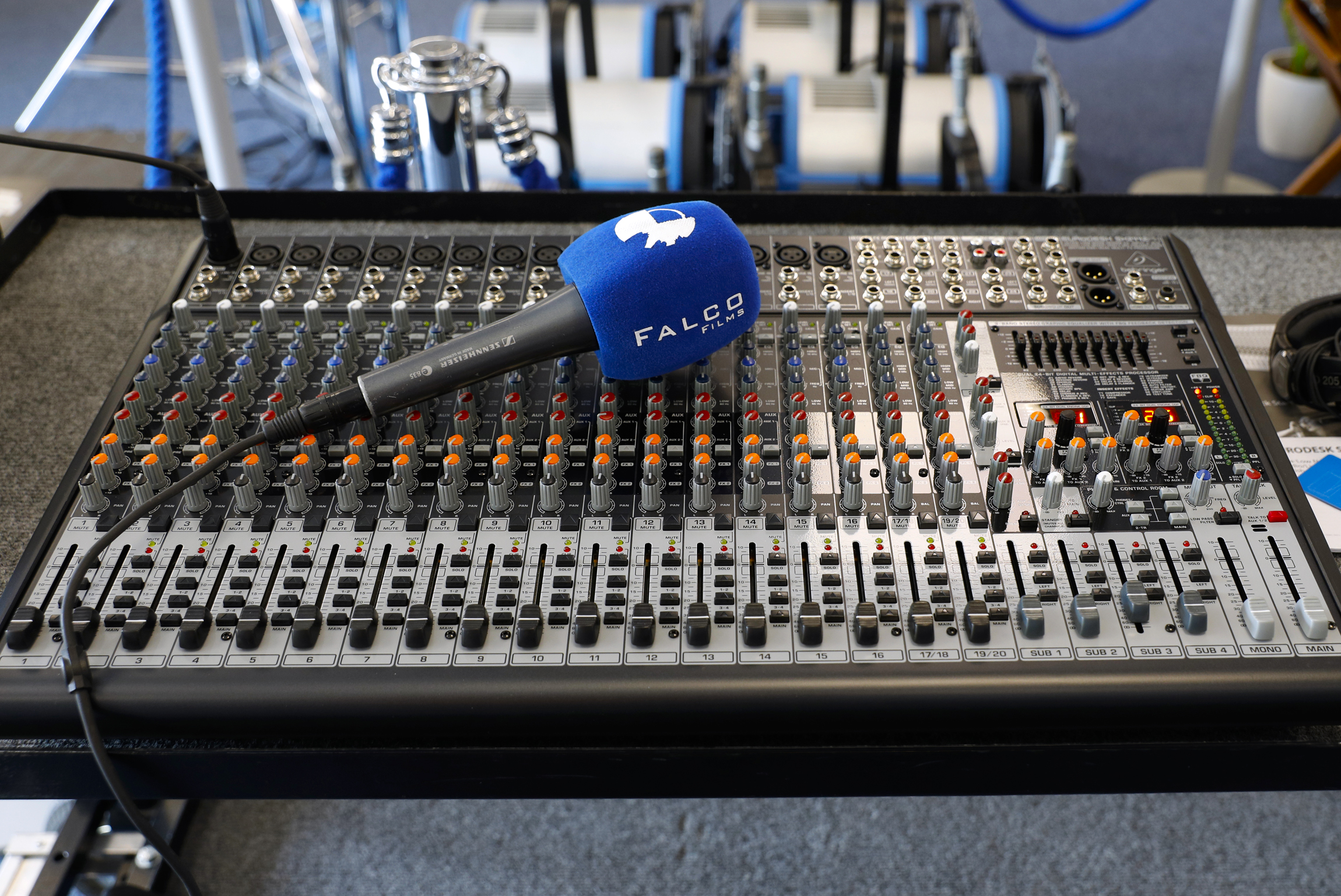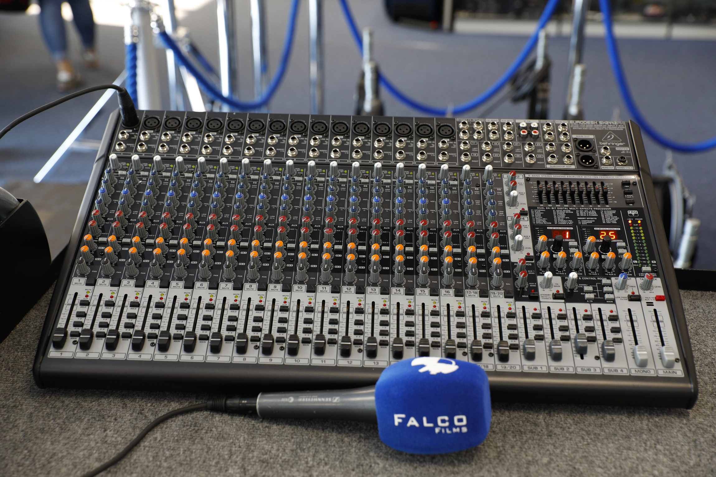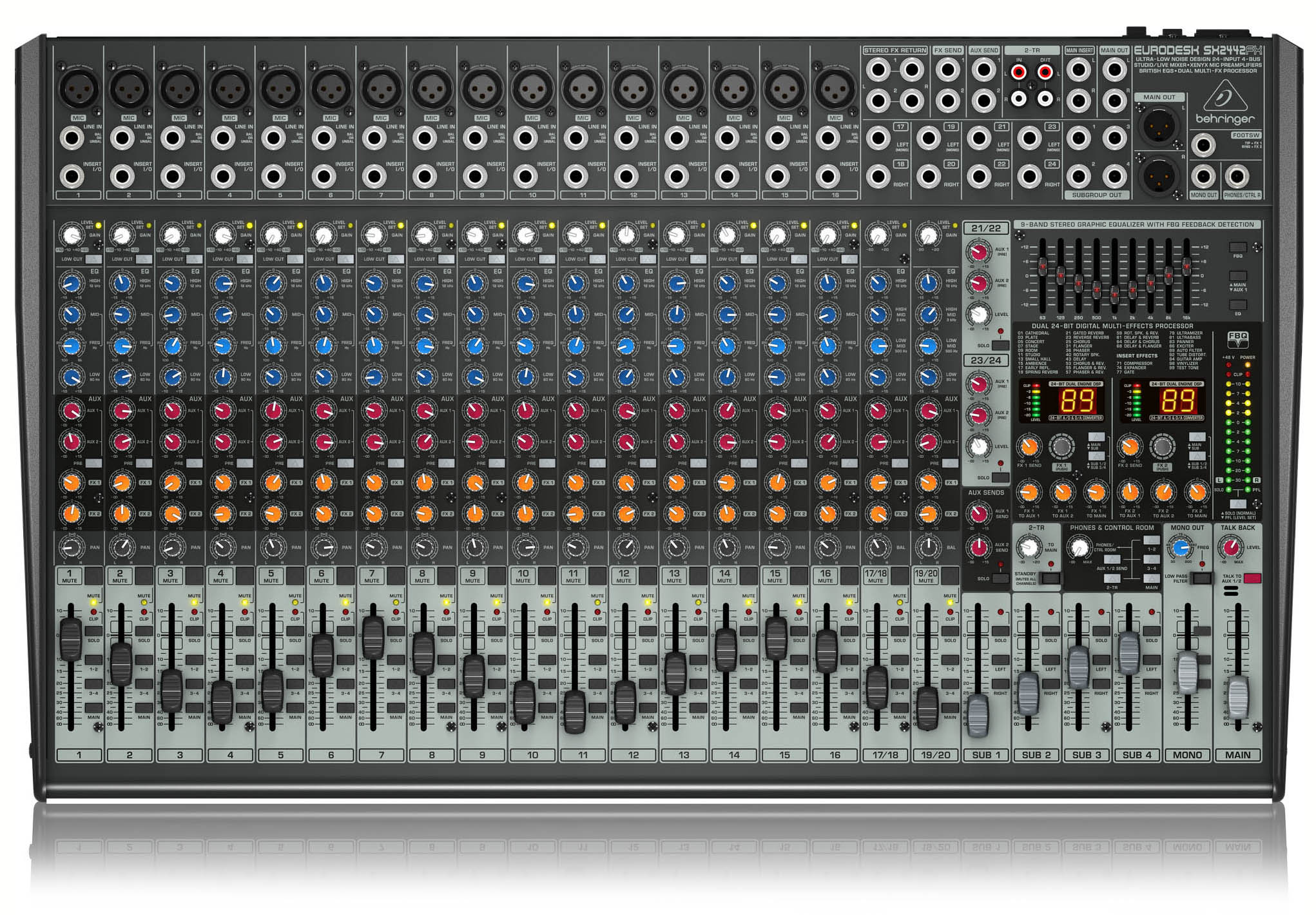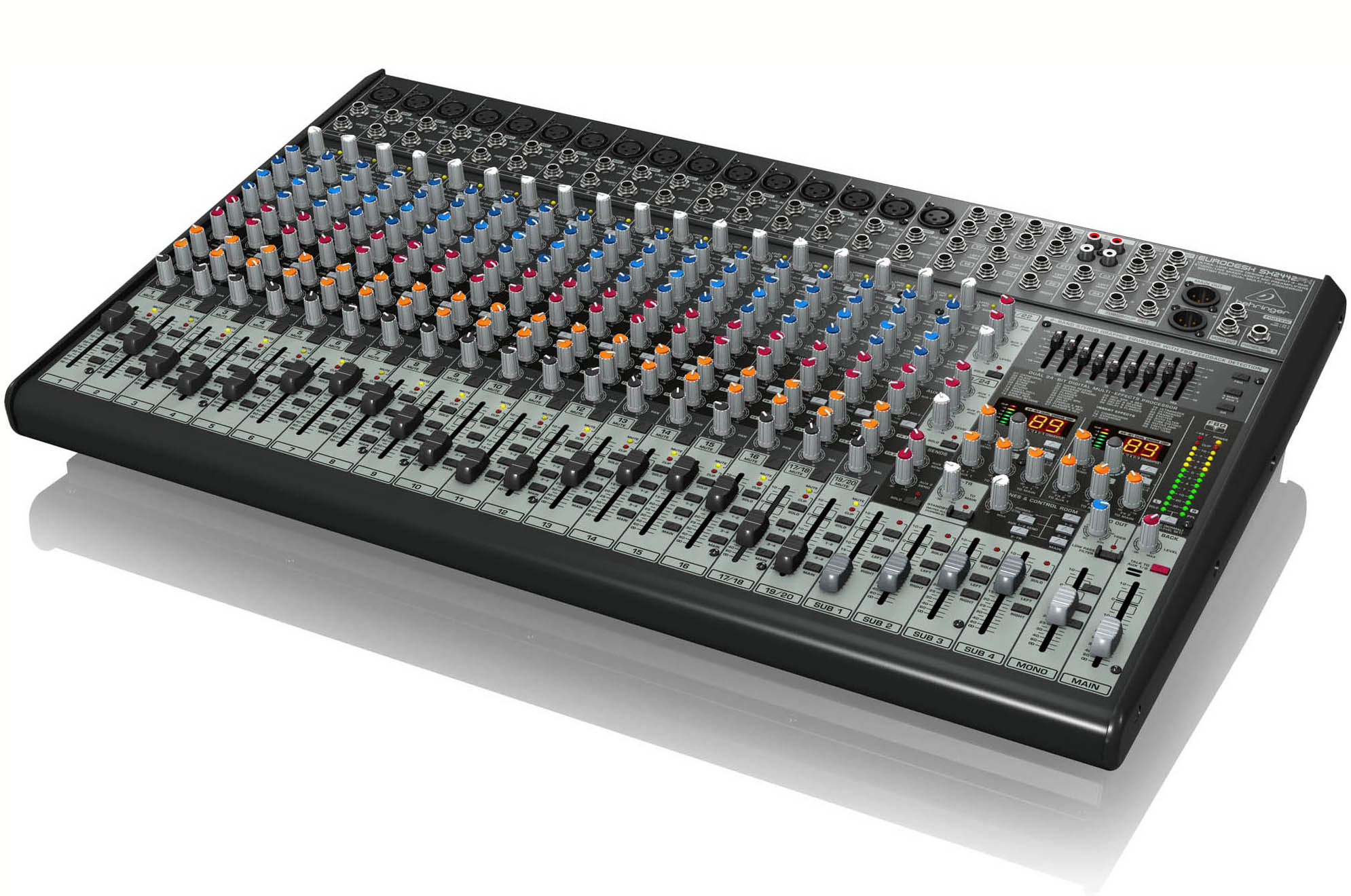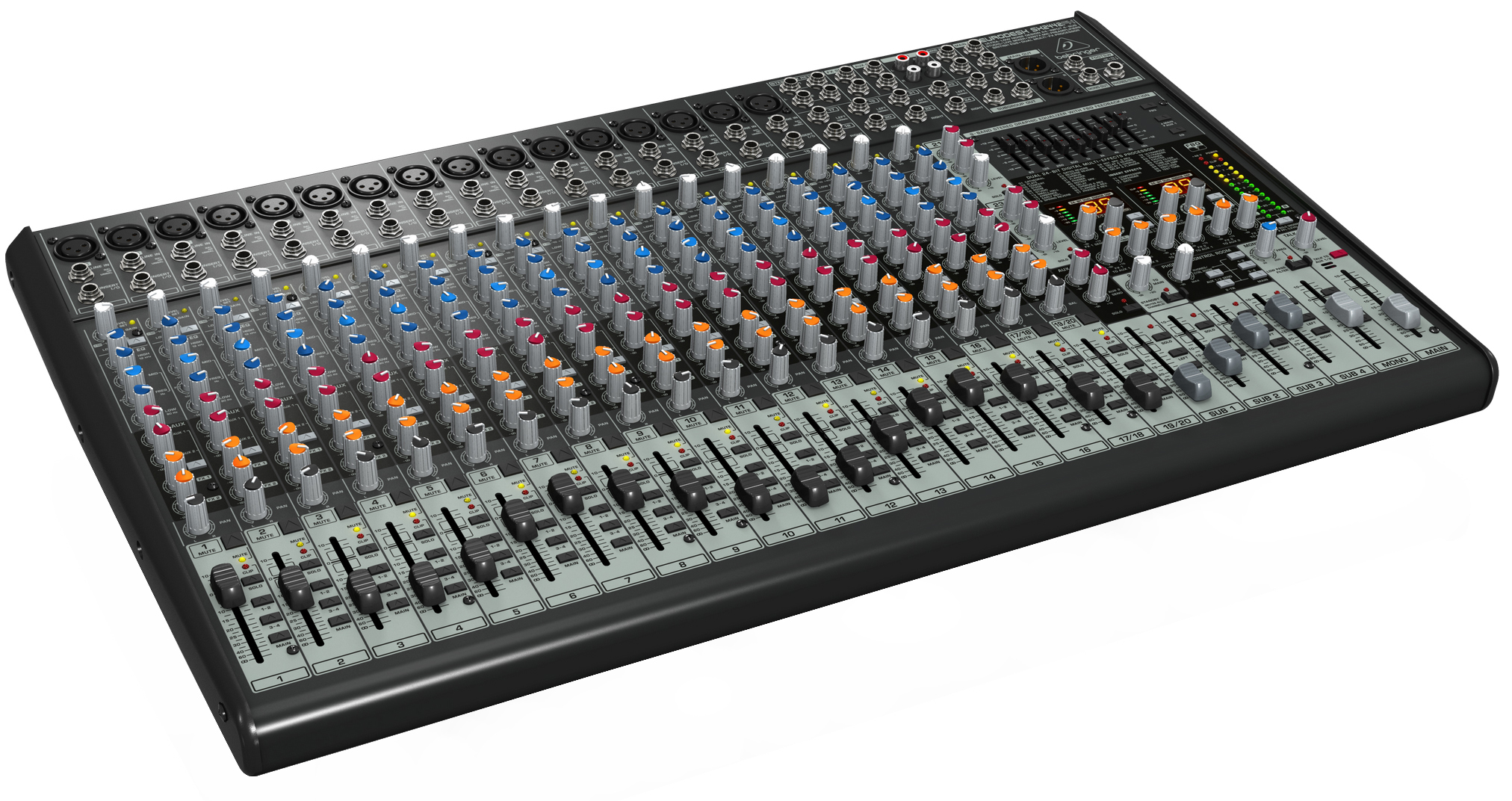 Mesa de 24 canales BEHRINGER SX2442FX: 16 entradas de micrófono con pre-amplificadores XENYX, ecualizador de 3 bandas, 2 procesadores de efectos, y detección de feedback.