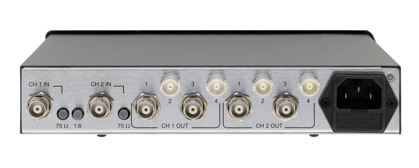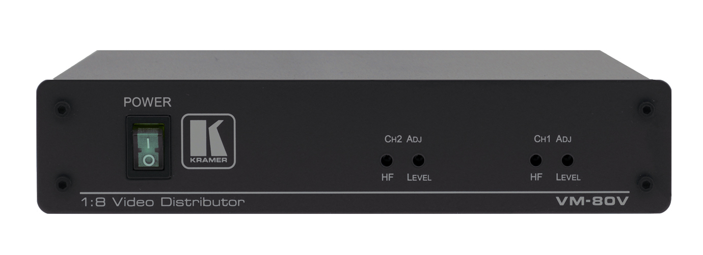 Distribuidor de vídeo KRAMER VM-80V, amplificador para señales compuestas o SDI, configurable como DA 1:4 para s-Vídeo, ancho de banda 330 MHz, ajustes de ganancia y pico.