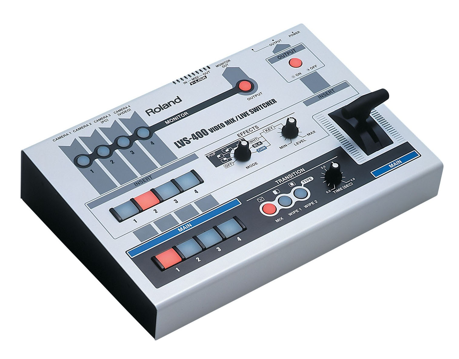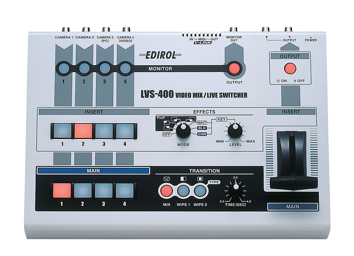 Mesa de video EDIROL LVS-400: 4 canales, T-Bar, efectos avanzados PiP, Luminance y Chroma Key, interfaz fácil, botones retroiluminados, conectores BNC.