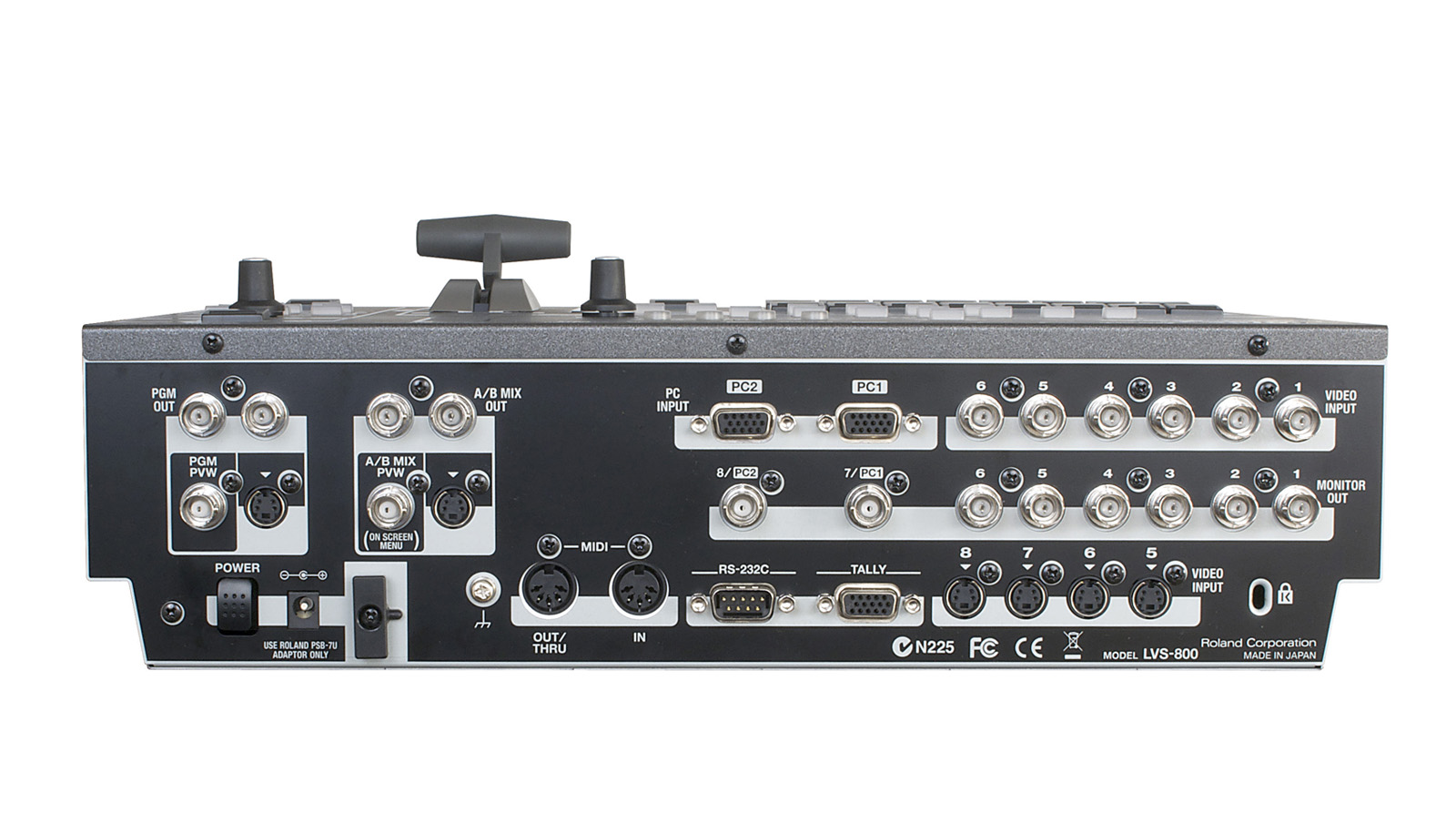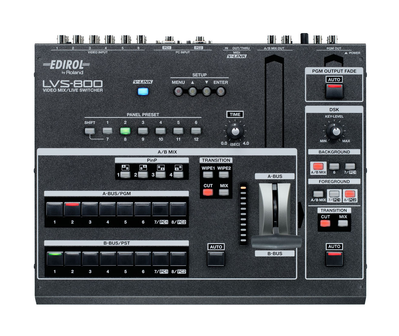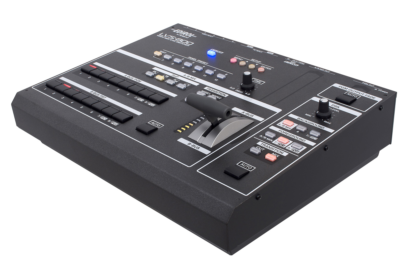 Mezclador de video Edirol LVS-800: 8 canales, 2 salidas independientes, 2 entradas PC/RGB, presets instantáneos, mezcla intuitiva, y DSK para gráficos y títulos superpuestos.