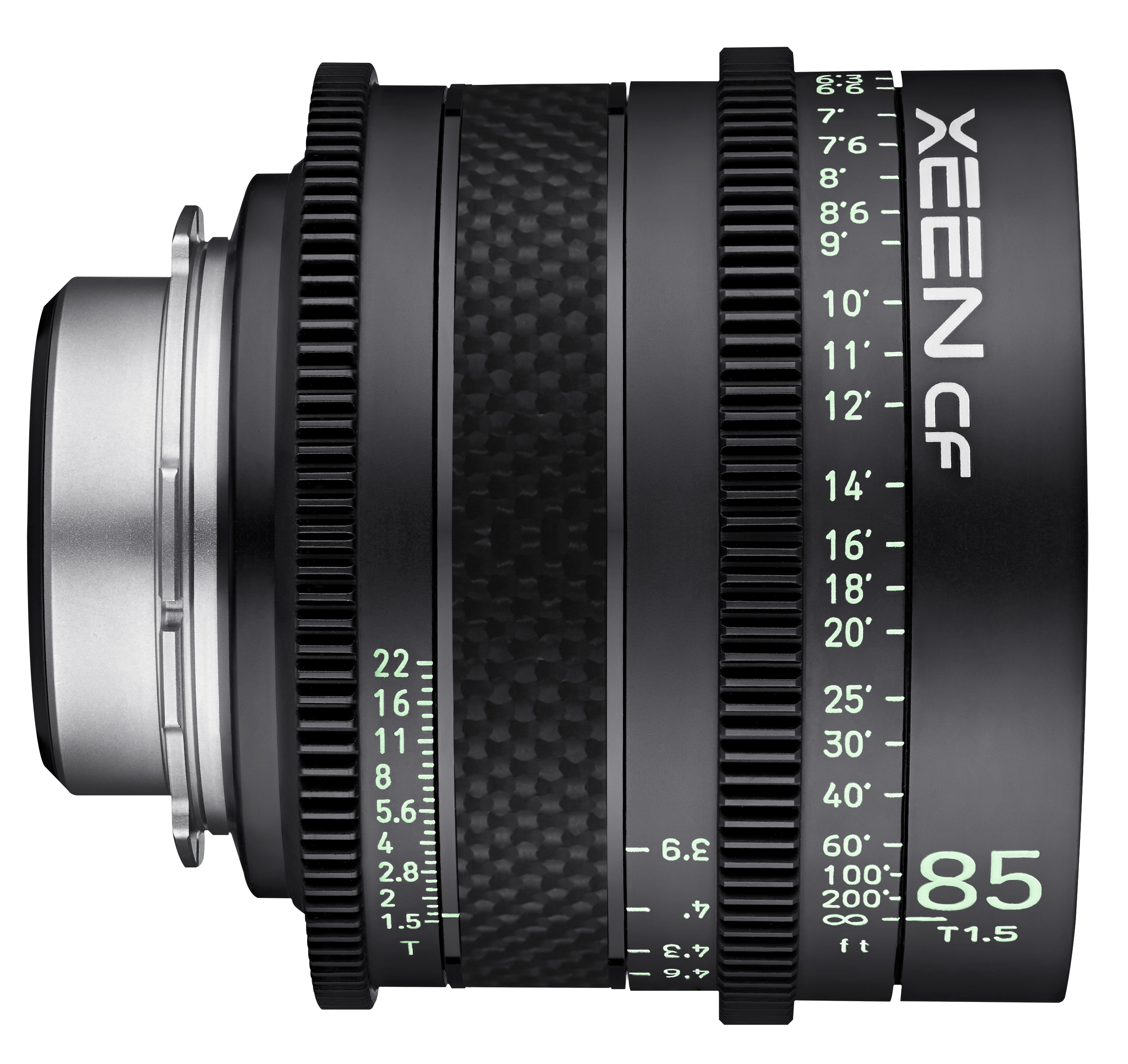 XEEN CF 85mm T1.5 con monturas E, EF y PL; cuerpo de fibra de carbono, apertura T1.5, escalas luminosas, compatible con 8K, ideal para cine.
