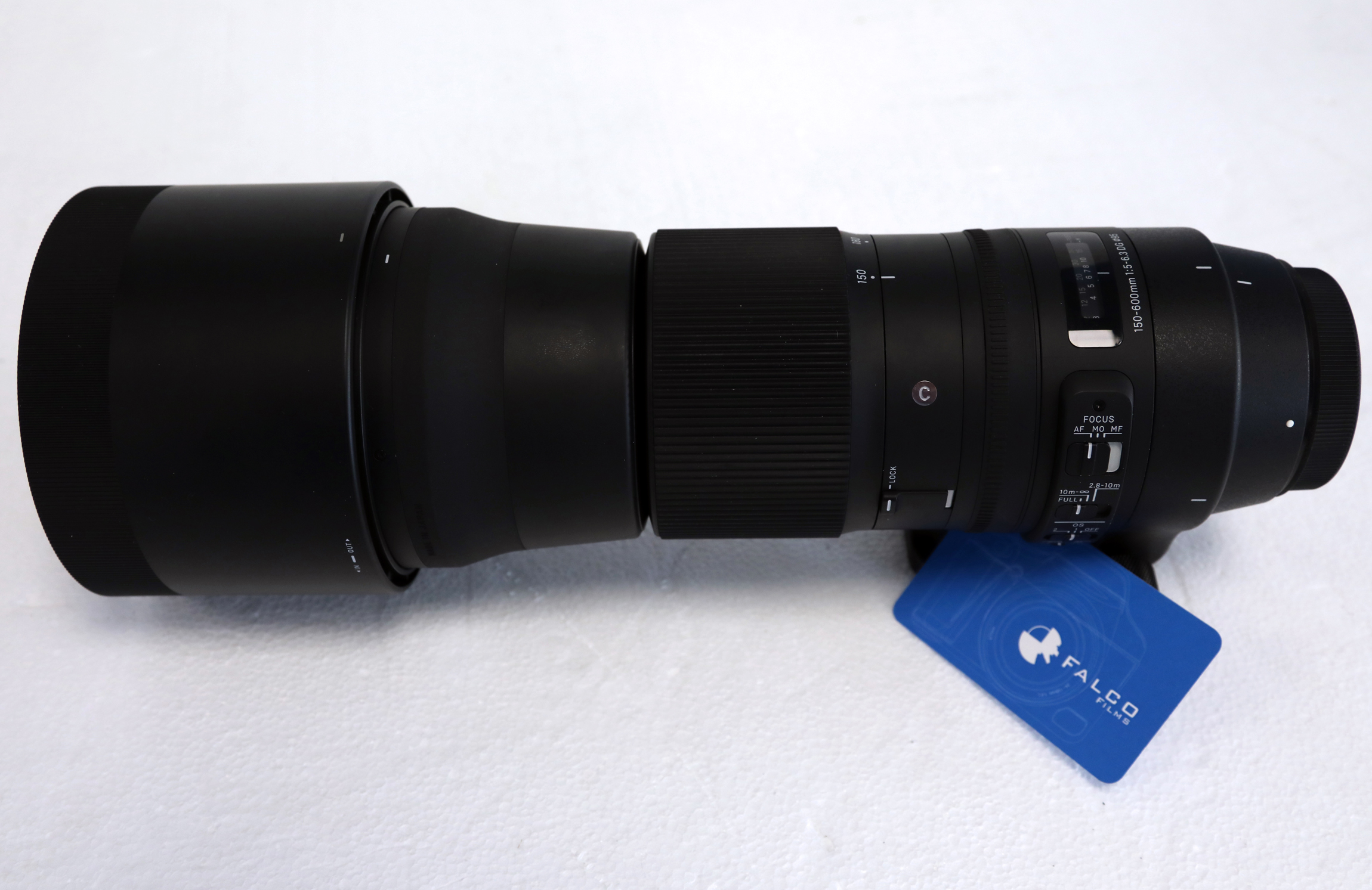 Lente telefoto SIGMA 150-600mm f/5-6.3 DG OS HSM para Canon EF con estabilización, funda incluída; construcción robusta de 20 elementos en 14 grupos, ideal para fotografía de larga distancia.