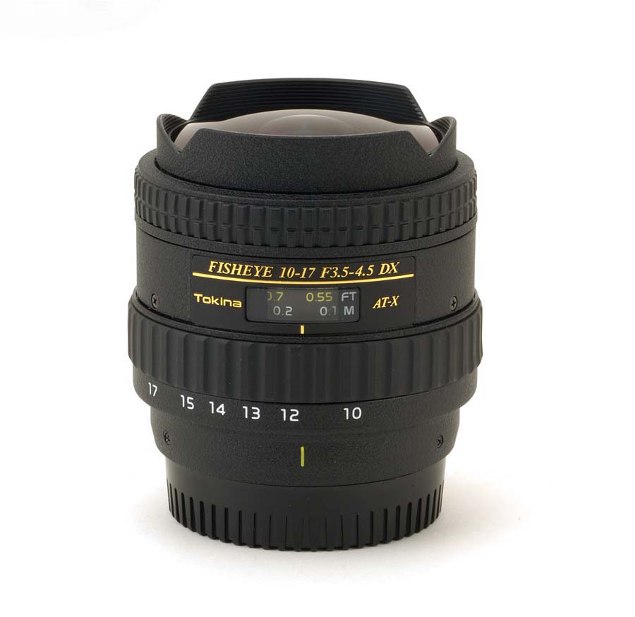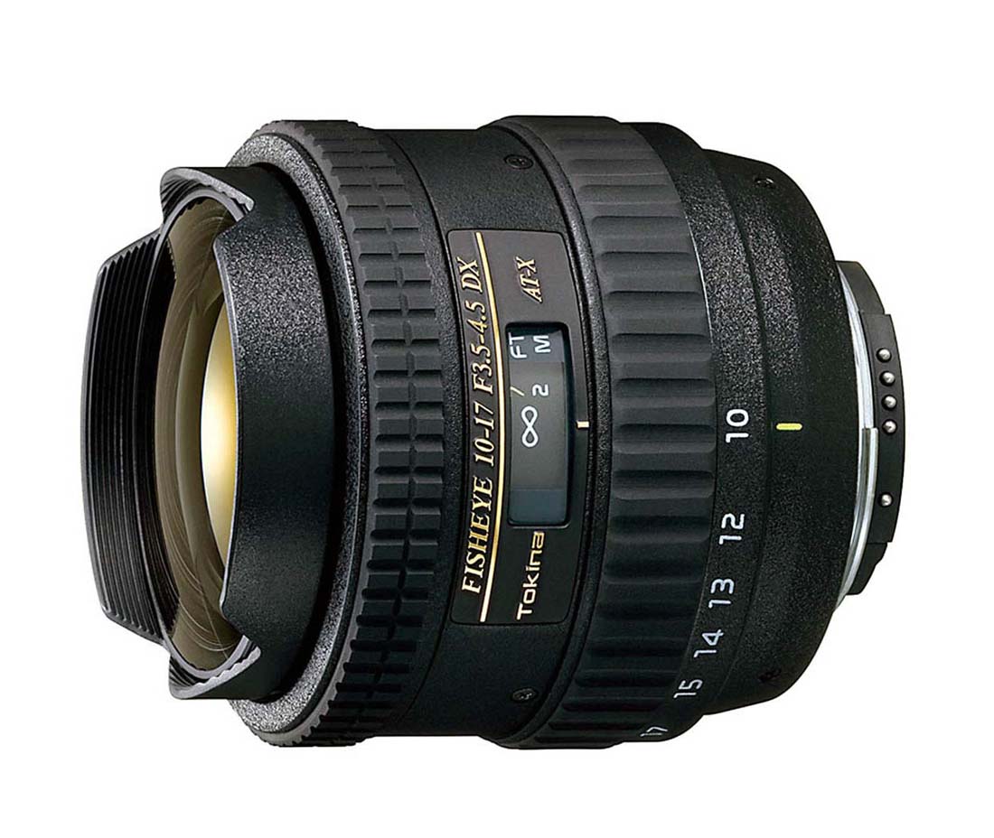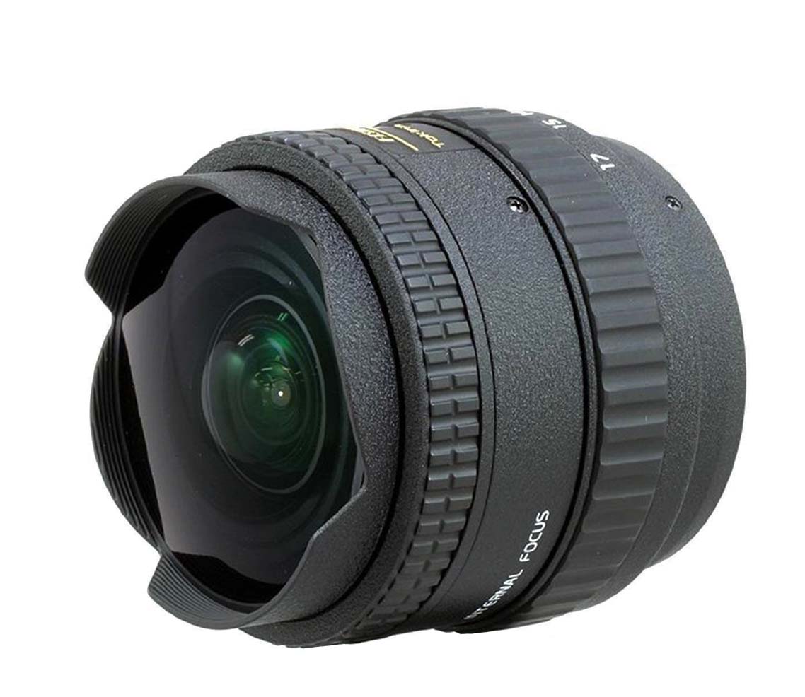 Lente ojo de pez Tokina 10-17mm para Canon, apertura f/3.5-4.5, ángulo de visión 180°, construcción óptica 10E/8G, distancia mínima 14 cm, peso 350g, parasol incorporado.