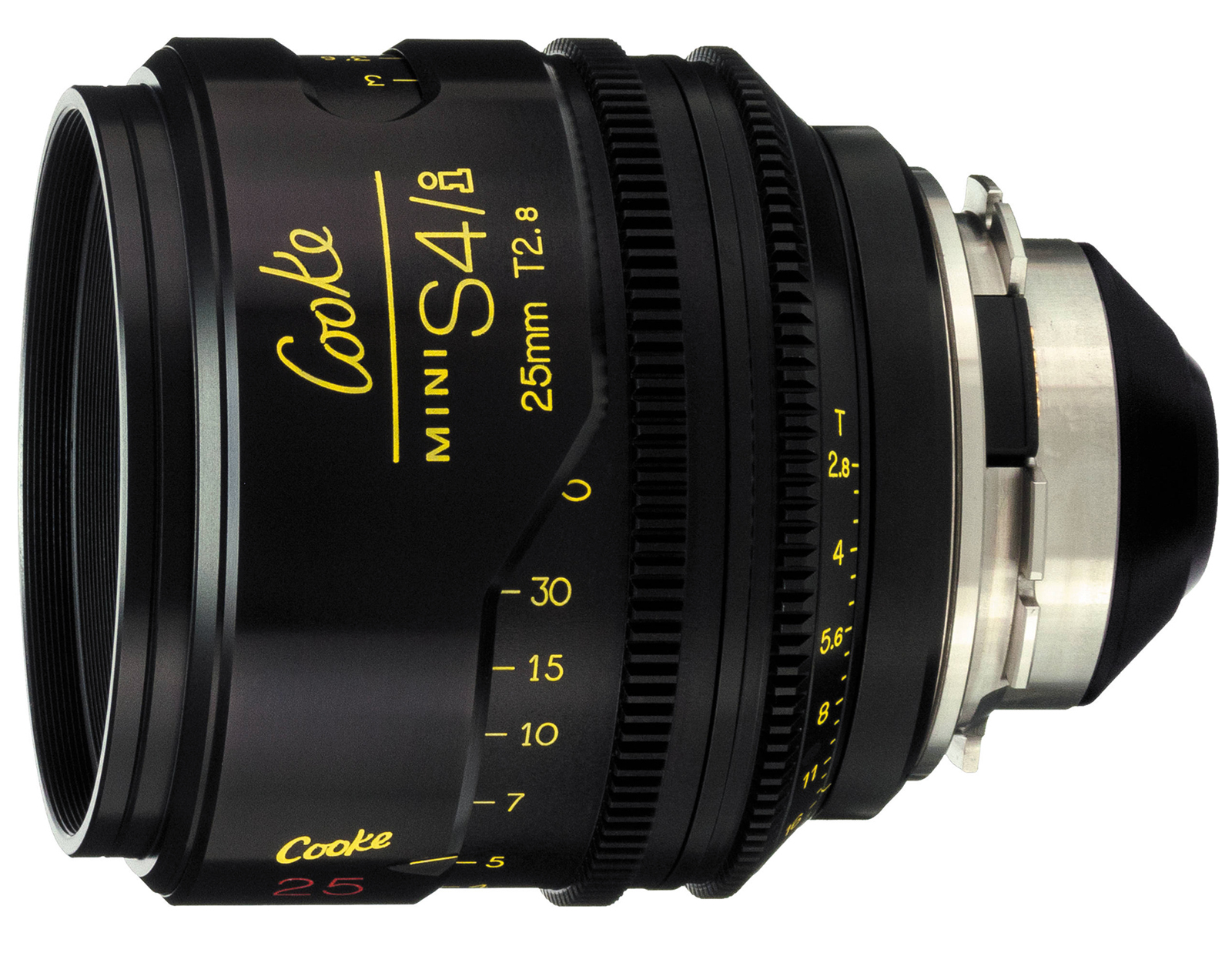 Lente COOKE S4/I MINI 25mm: Resolución superior a 4K, apertura T2.8 a T22, tecnología metadatos, colorimetría balanceada y diseño ligero para ajustes de foco suaves.