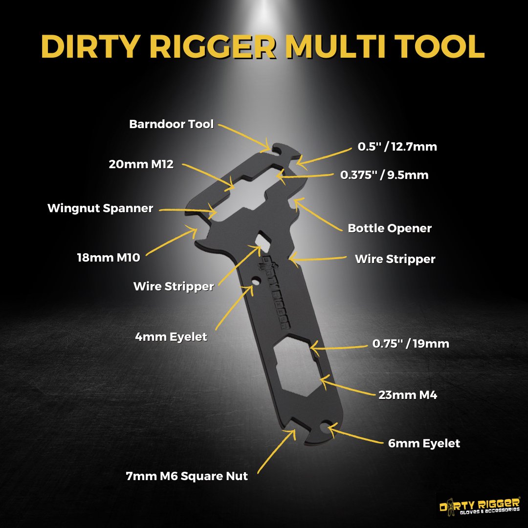 La Multi Herramienta 14 en 1 de Dirty Rigger es una herramienta esencial para técnicos de iluminación, riggers y profesionales del audiovisual que requieren versatilidad y resistencia en su equipo. Fabricada en acero endurecido de 4 mm y con un acabado en polvo negro mate, esta herramienta combina 14 funciones en un diseño compacto y robusto. Su diseño inteligente permite un acceso rápido y eficiente a las herramientas más utilizadas en el entorno profesional.