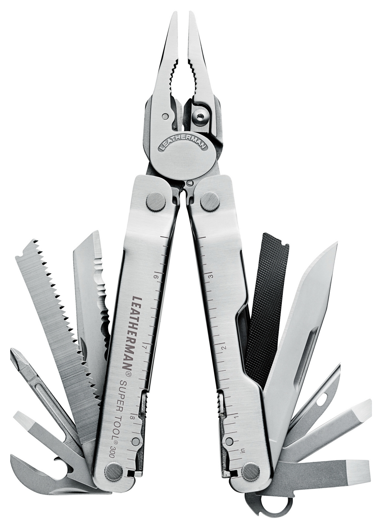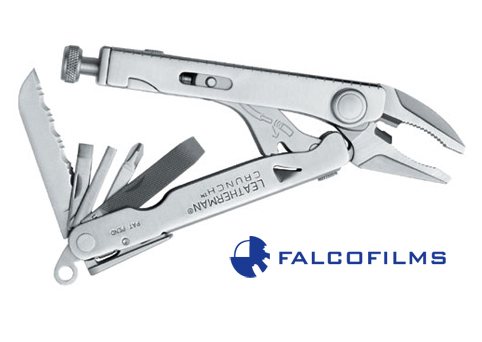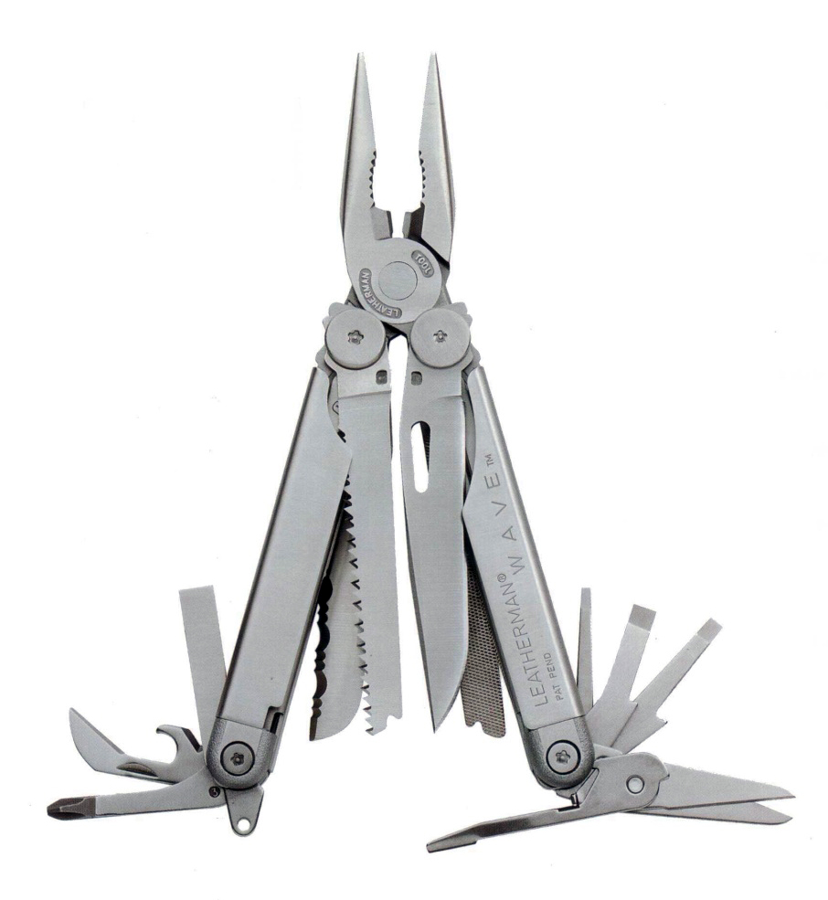 Herramienta multiuso de acero inoxidable con funda piel.