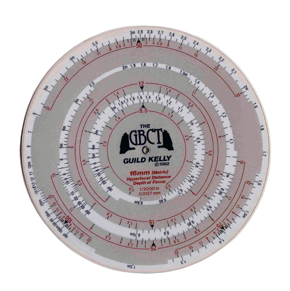 Medidor de profundidad de campo 16mm, ideal para profesionales cinematográficos, calcula distancias hiperfocales, ángulo de obturación, exposición y velocidades en pies y pulgadas.