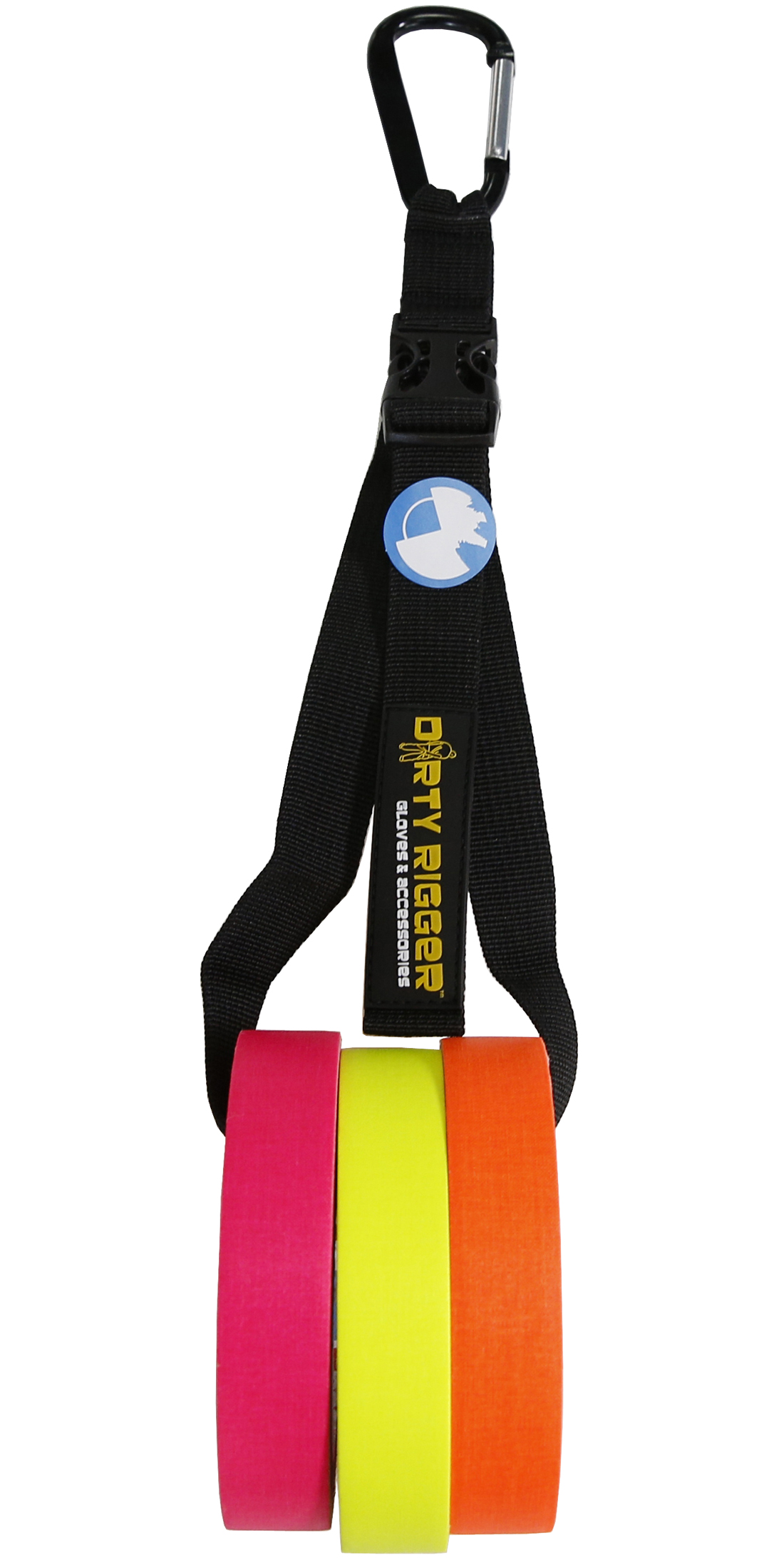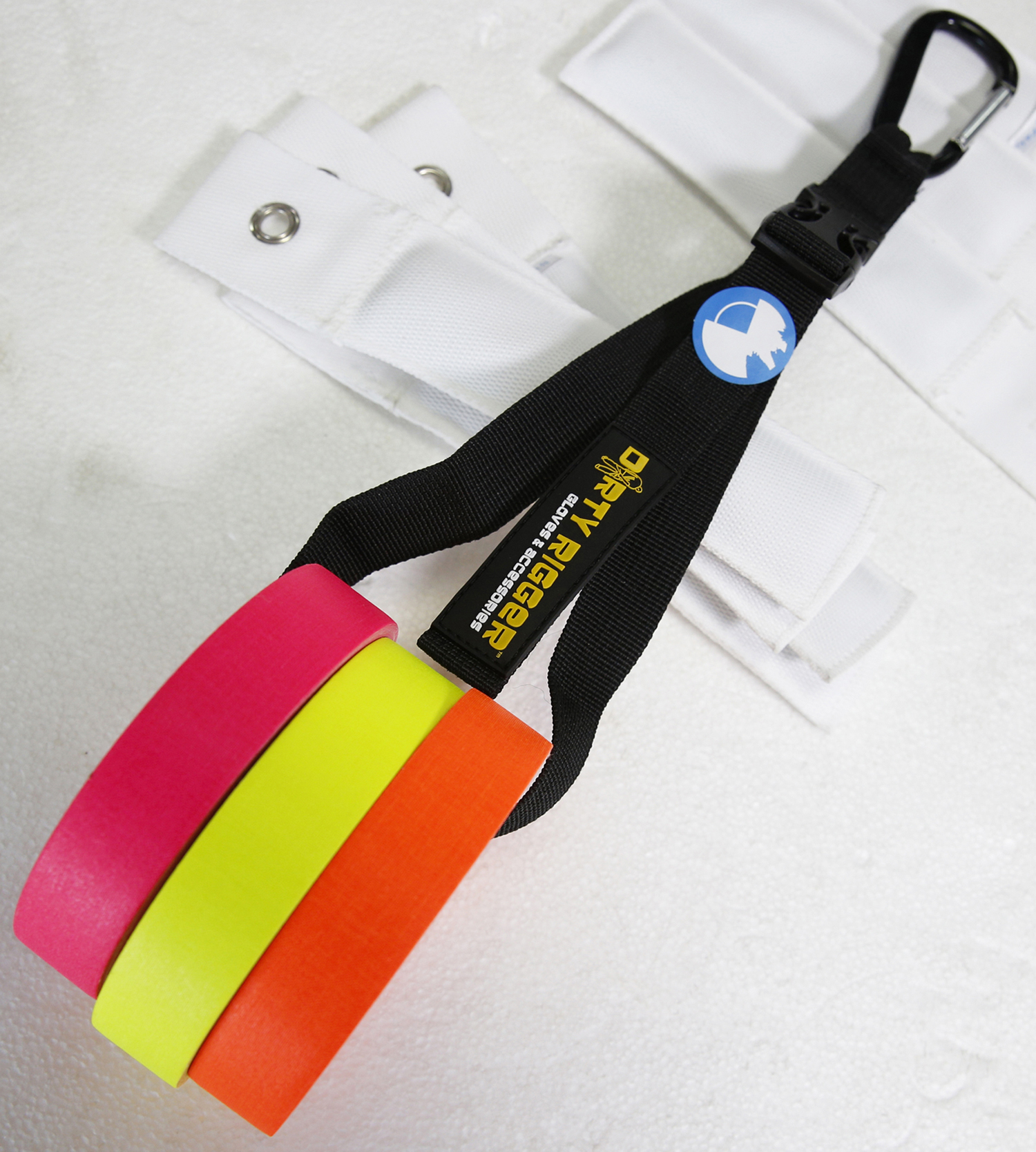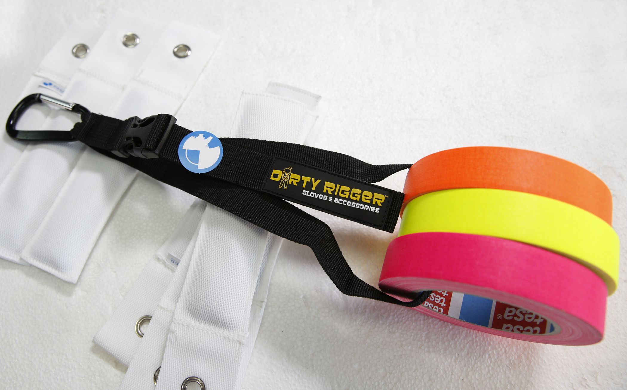 Para llevar comodamente cintas de cámara y cinta americana colgado del cinturón.