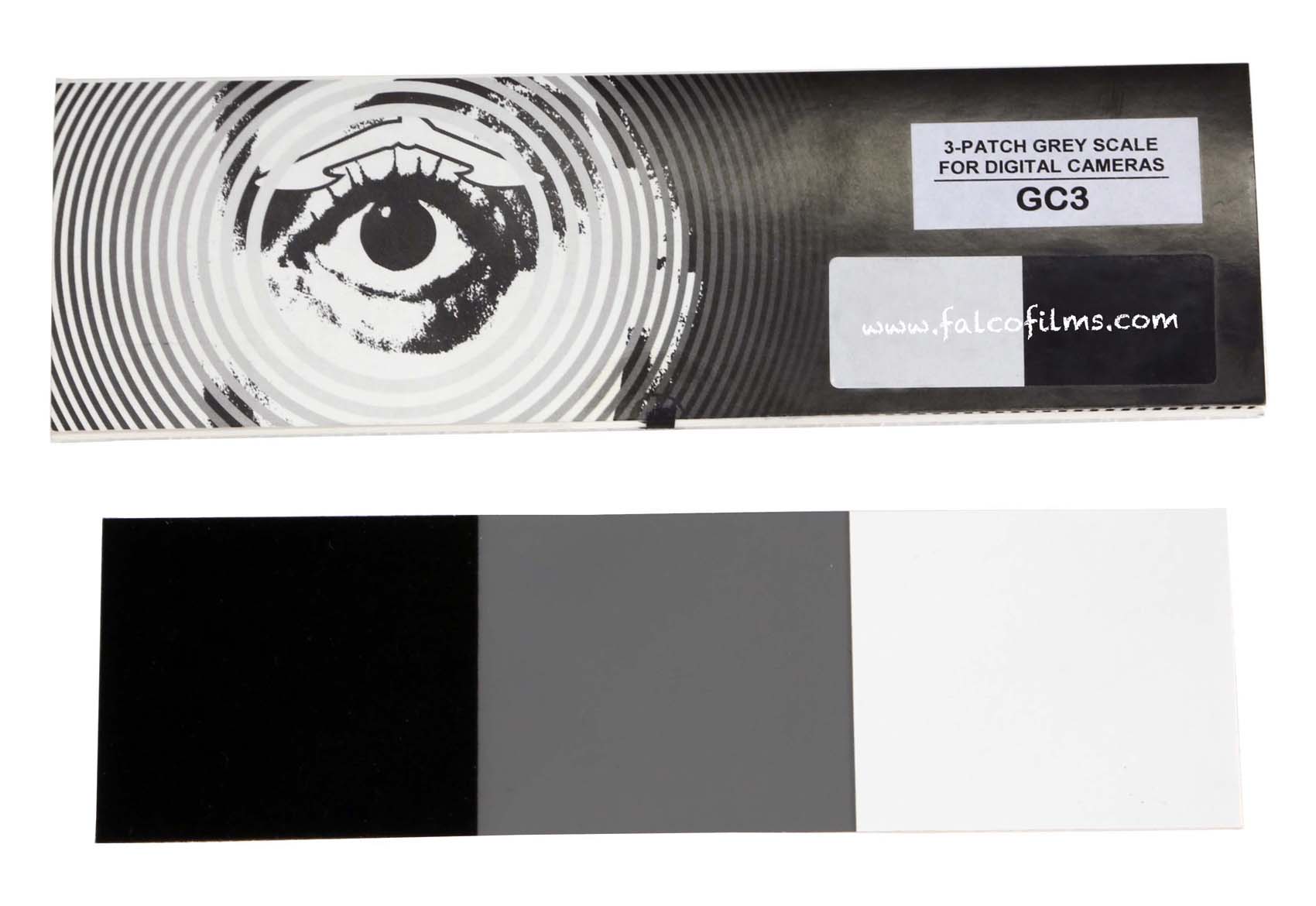 Carta escala de grises de 3 pasos para cámaras digitales, con porcentajes de 1%, 18% y 90%, tamaño 60x203mm, mate sobre cartón.