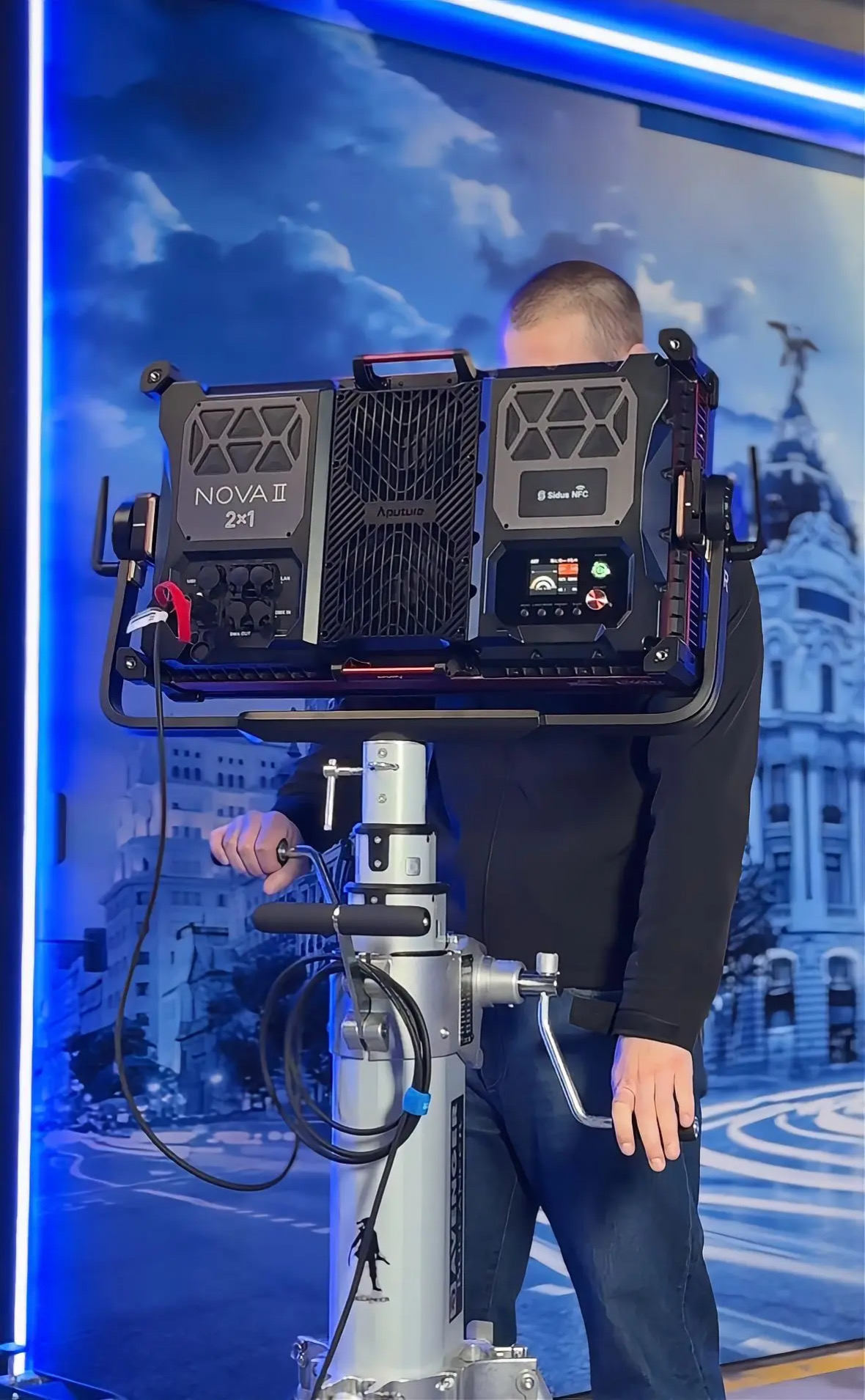 Su sistema de montaje frontal de accesorios amplía las posibilidades creativas y agiliza el montaje de modificadores. El kit incluye el panel de 1000W (21kg), difusor plano, cable a cabeza de 6m, horquilla extraíble para su montaje en escenarios, trusses o exteriores, y maleta con ruedas.