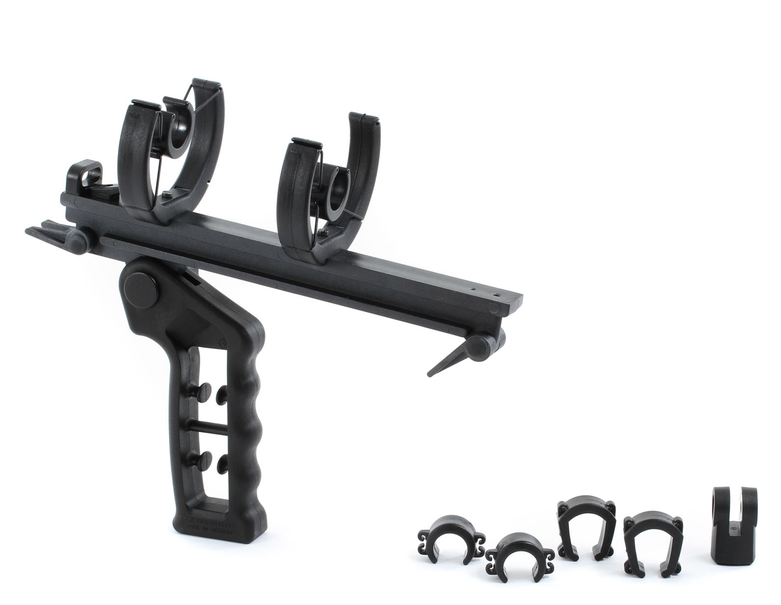 Pistola suspensoria SENNHEISER MZS 20-1: suspensión elástica para atenuar ruidos estructurales, compatible con micrófonos MKH, incluye ligas y adaptadores de cuerda.