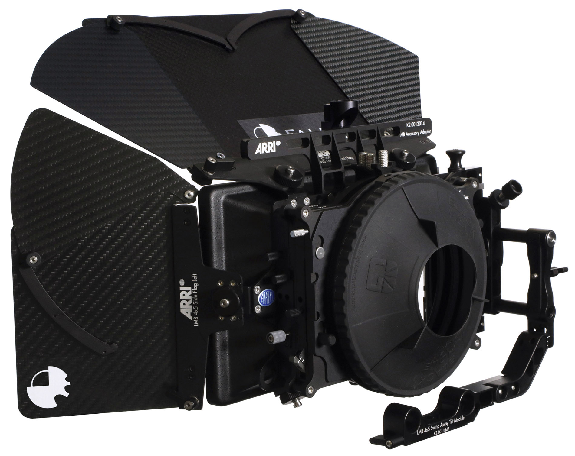 Portafiltros ARRI LMB 4X5, modular y ligero, soporta filtros 4"x5.65" y 4"x4", compatible con barras 15mm/19mm, incluye bandejas, inclinación y almacenamiento fácil.