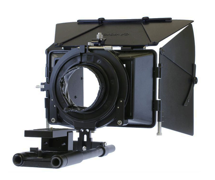 Portafiltros Matte Box Cavision MB4512 para cámaras DSLR, con visera, dos portafiltros (uno rotatorio), sistema barras RS15IIMQ, y soporte para filtros 4x4.