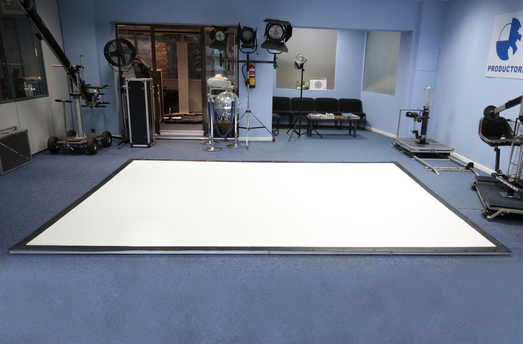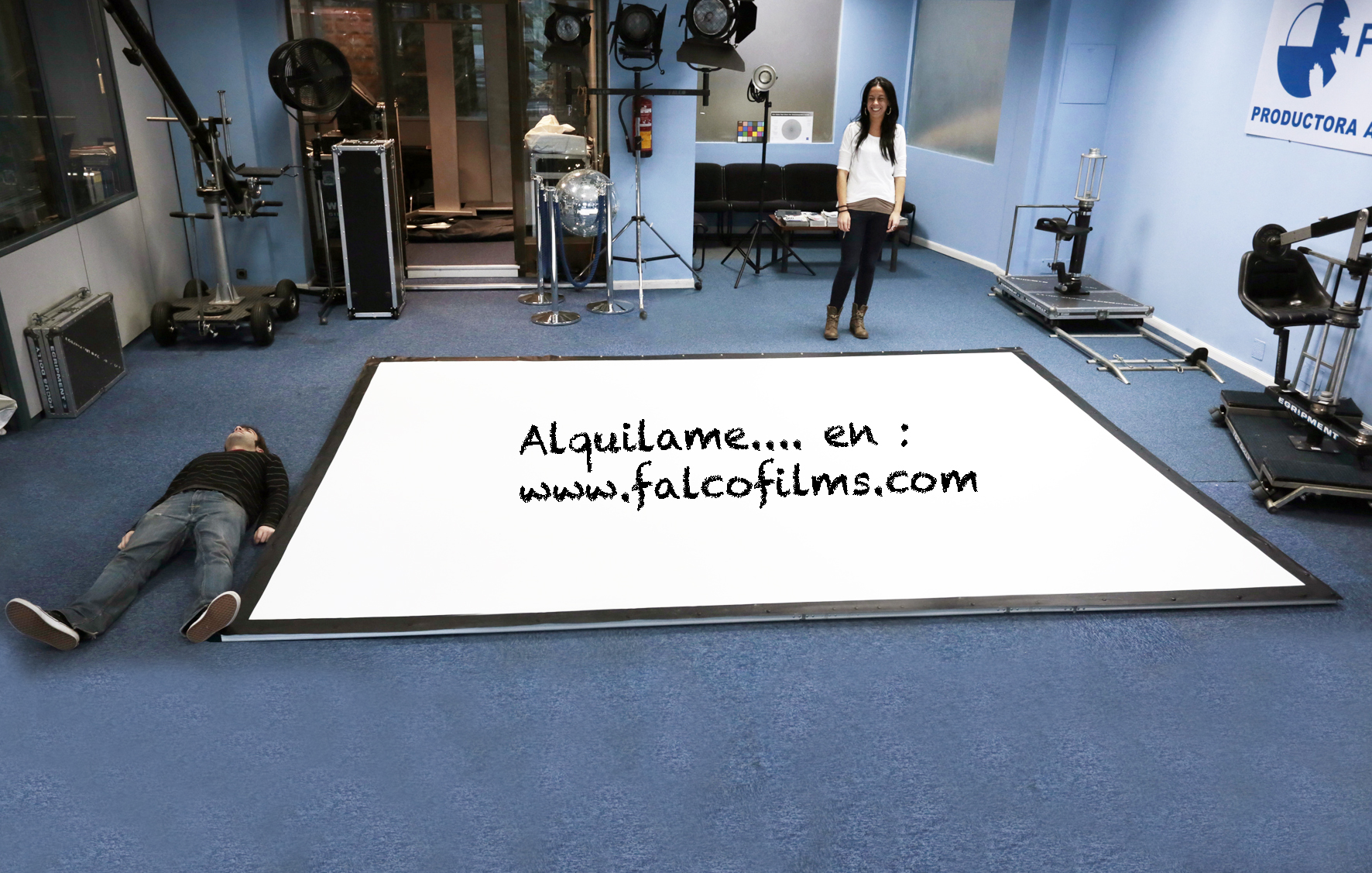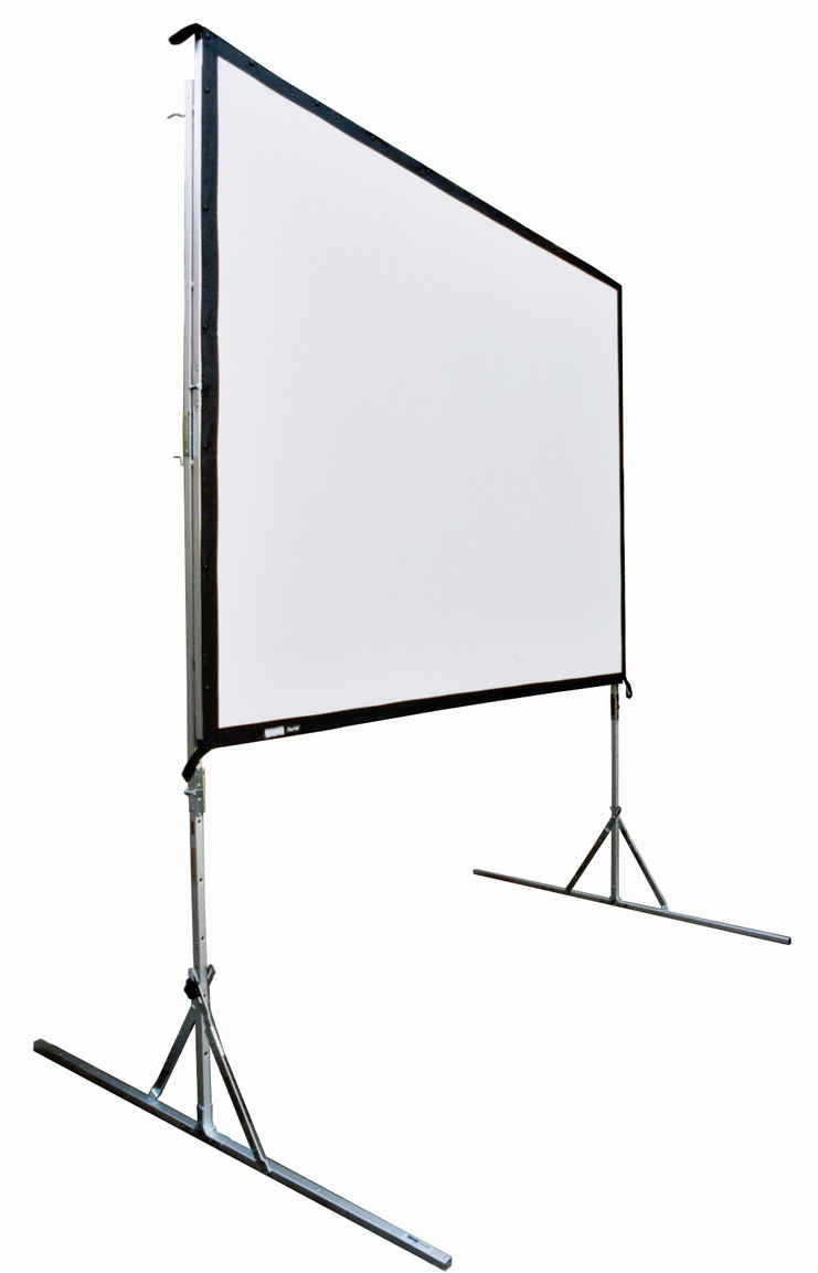 Pantalla de proyección desmontable de 4x3m. Incluye maleta, marco y tela para proyección o retroproyección. Alquiler disponible. Modelo: Grandview Supermobile Series.