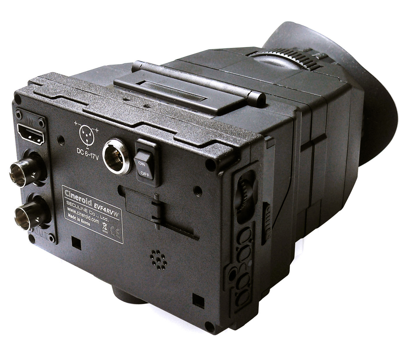 El EVF es un monitor LCD de 3,2” y una resolución de 800×480 con entrada HDMI y composite, y salida de audio. Con un consumo de tan solo 3,5W la batería que viene con el visor electrónico le da una autonomía de 4 horas, pero también acepta baterías de 4400mA y 6600mA.