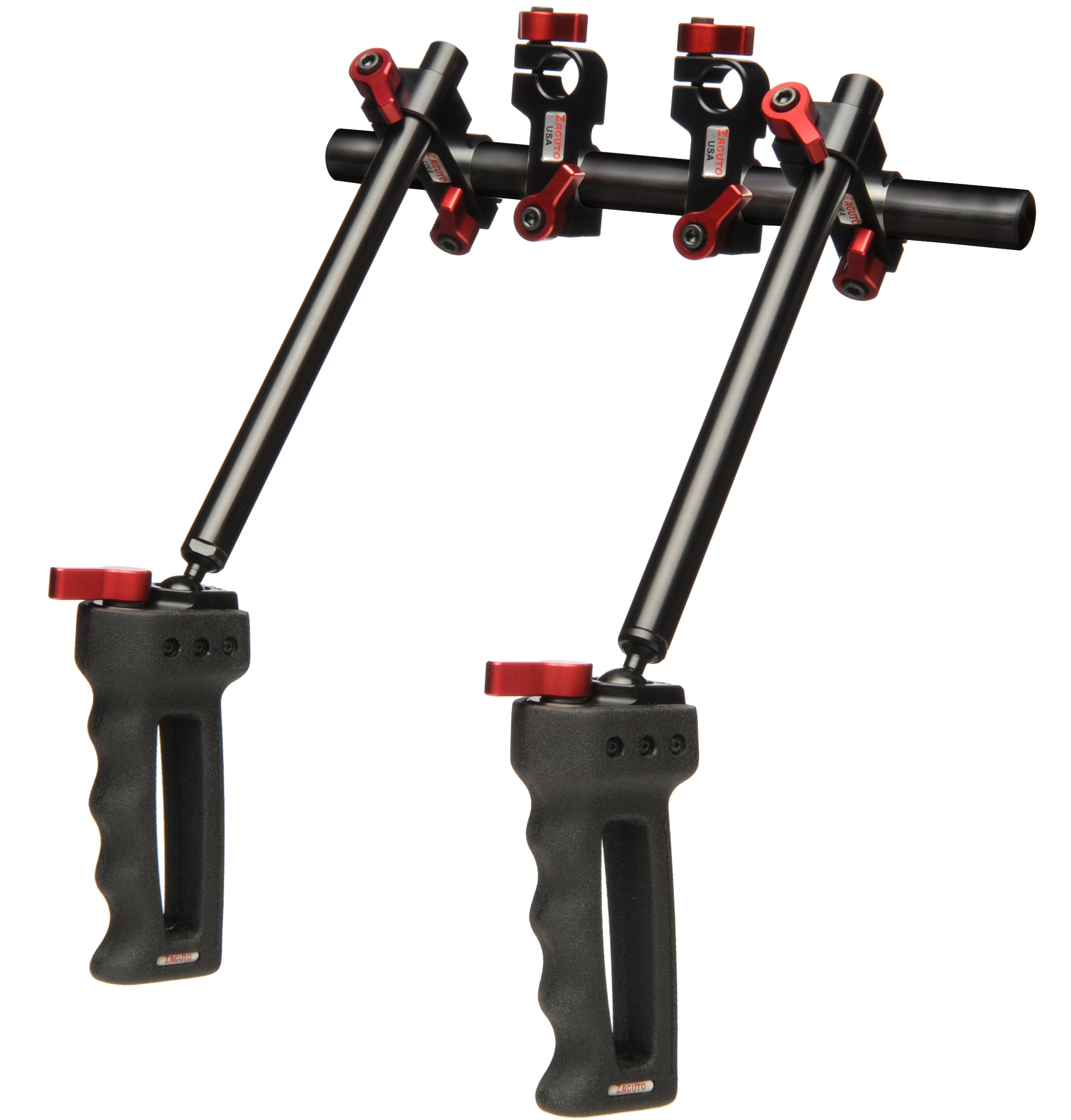 These Zgrips Beefy are very strong and infinitely adjustable handgrips for heavy HD camera packages such as RED setups. The handgrips can move up and down, left or right, together or independently, and can be set at different lengths and positions. They can also be broken down and used individually on any 19mm or 15mm rod.